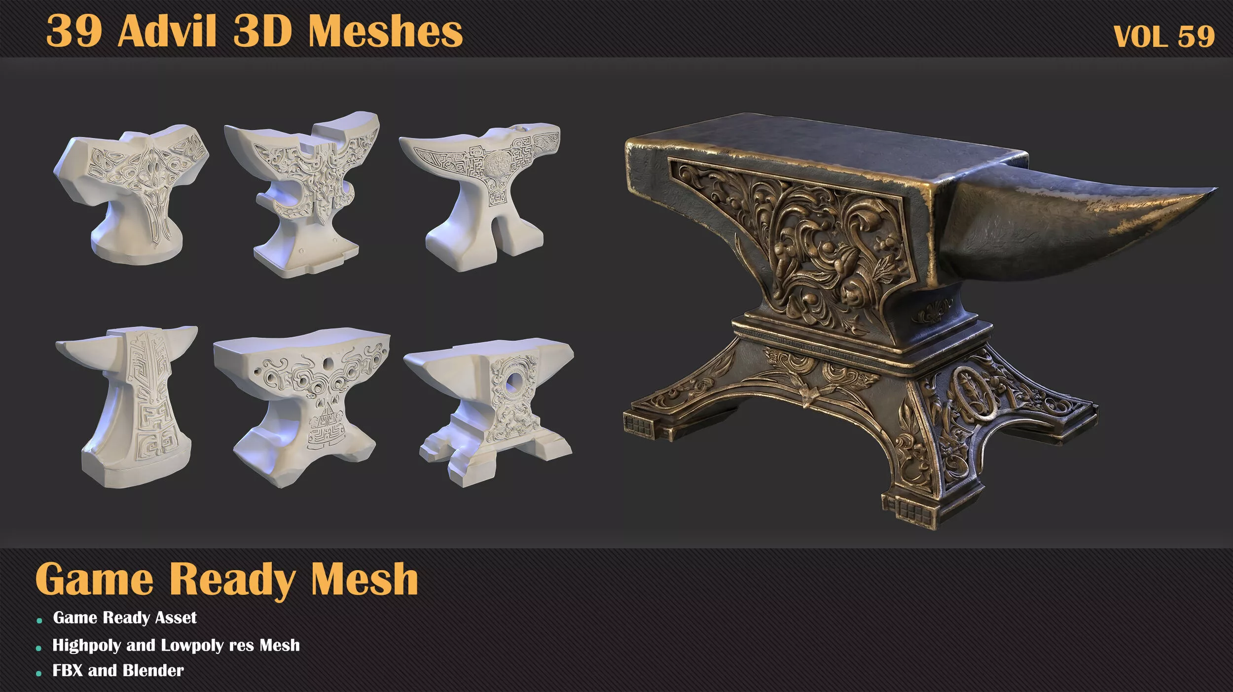 Anvil – Game Ready 3D ModelA detailed 3D anvil model with ornamental carvings, ready for use in games, cinematic scenes, and real-time environments.This model includes both highpoly and lowpoly versions, ready to drop directly into any game engine or rendering pipeline with no extra setup.What's Included: