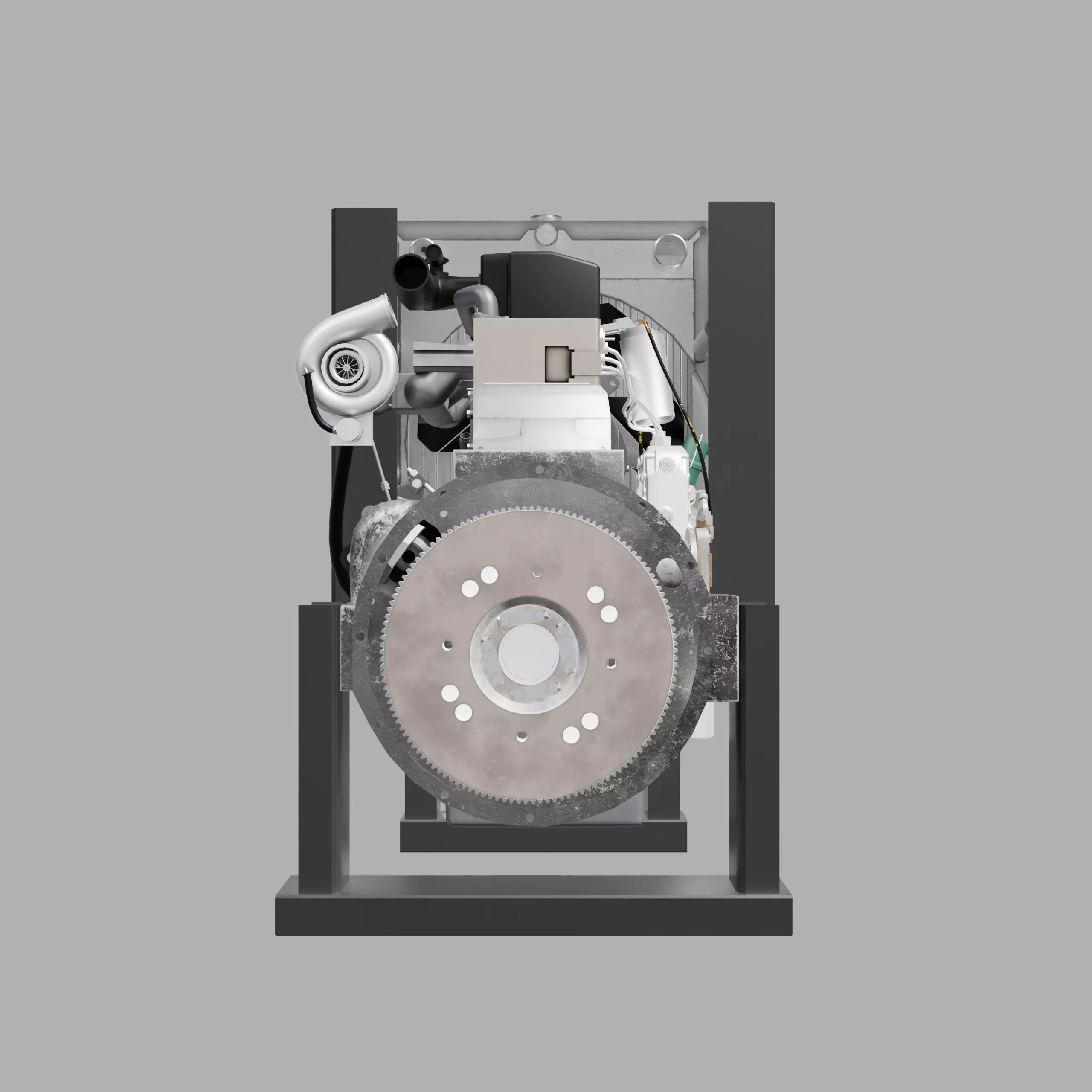 Realistic mechanical components (turbo, flywheel, radiator, filters, mounts)