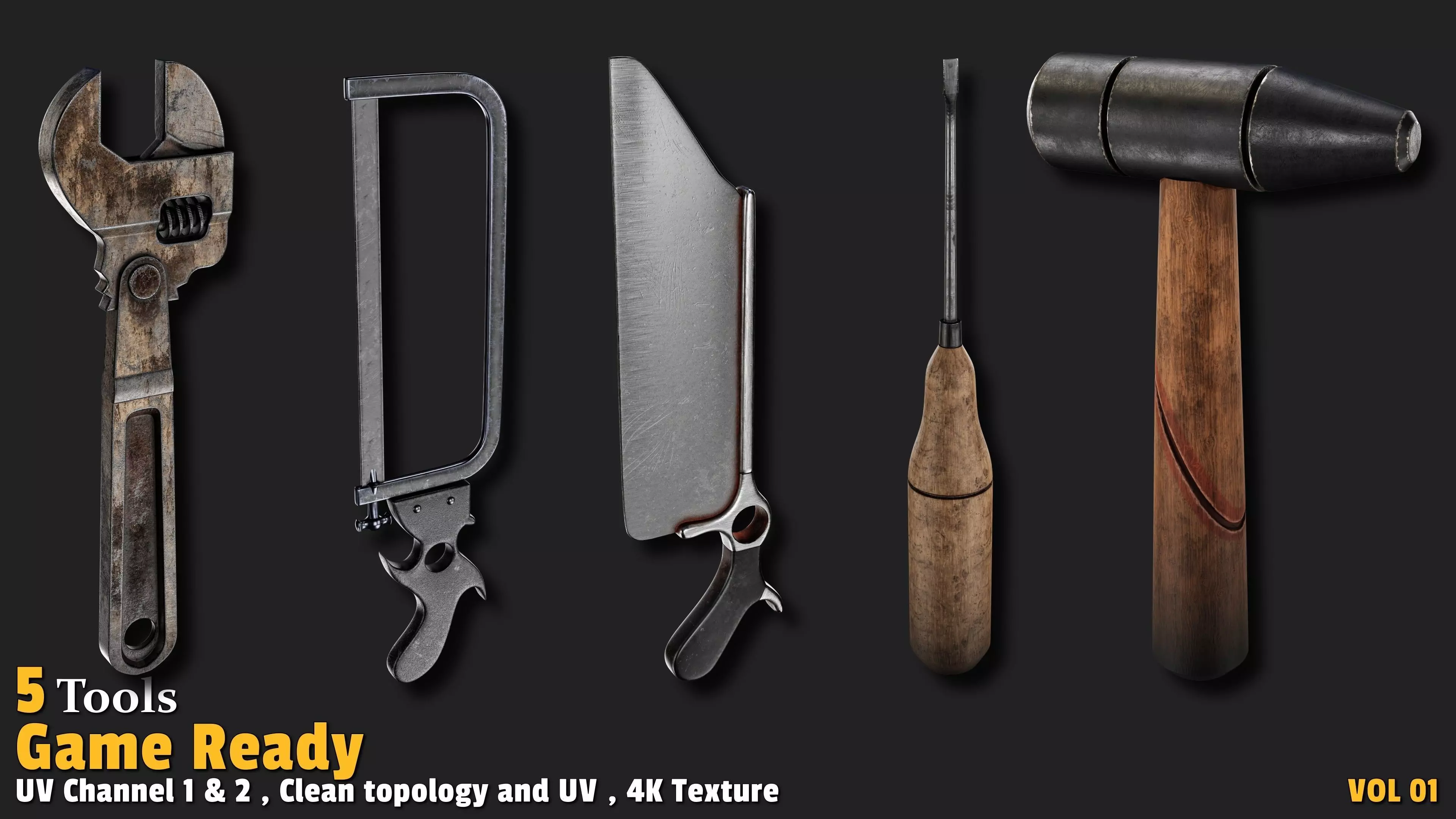 Ready to equip your game world with realistic, ready-to-use tools? This collection of 5 textured 3D tool models, crafted with professional materials and 4K textures (including Base Color, Normal, and ORM), is designed to shine instantly in your game development projects! Whether you're building an exciting industrial workshop or designing a construction-themed game, these models deliver unmatched quality and realistic detail for an immersive gaming experience. Each model features a clean, quad-based topology with polygon counts ranging from 600 to 3,000, offering a perfect balance between performance and detail. UV-unwrapped with 2 texture channels, this set is fully optimized for seamless integration into your game environment without any additional adjustments.