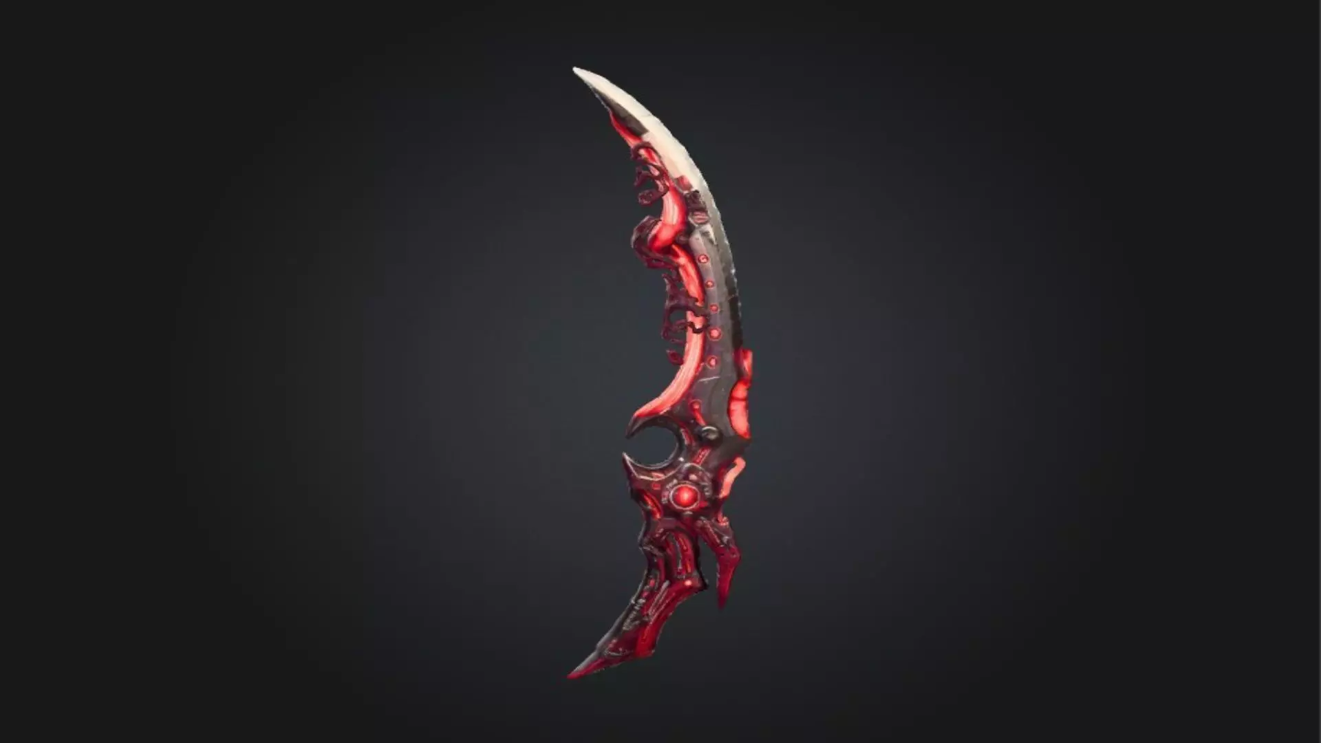 The dagger showcases a curved blade with glowing red energy veins running through its structure, creating a sense of dark magic and corruption. The handle is uniquely designed with an ergonomic grip and a circular finger ring, making it perfect for assassin or rogue-type characters.