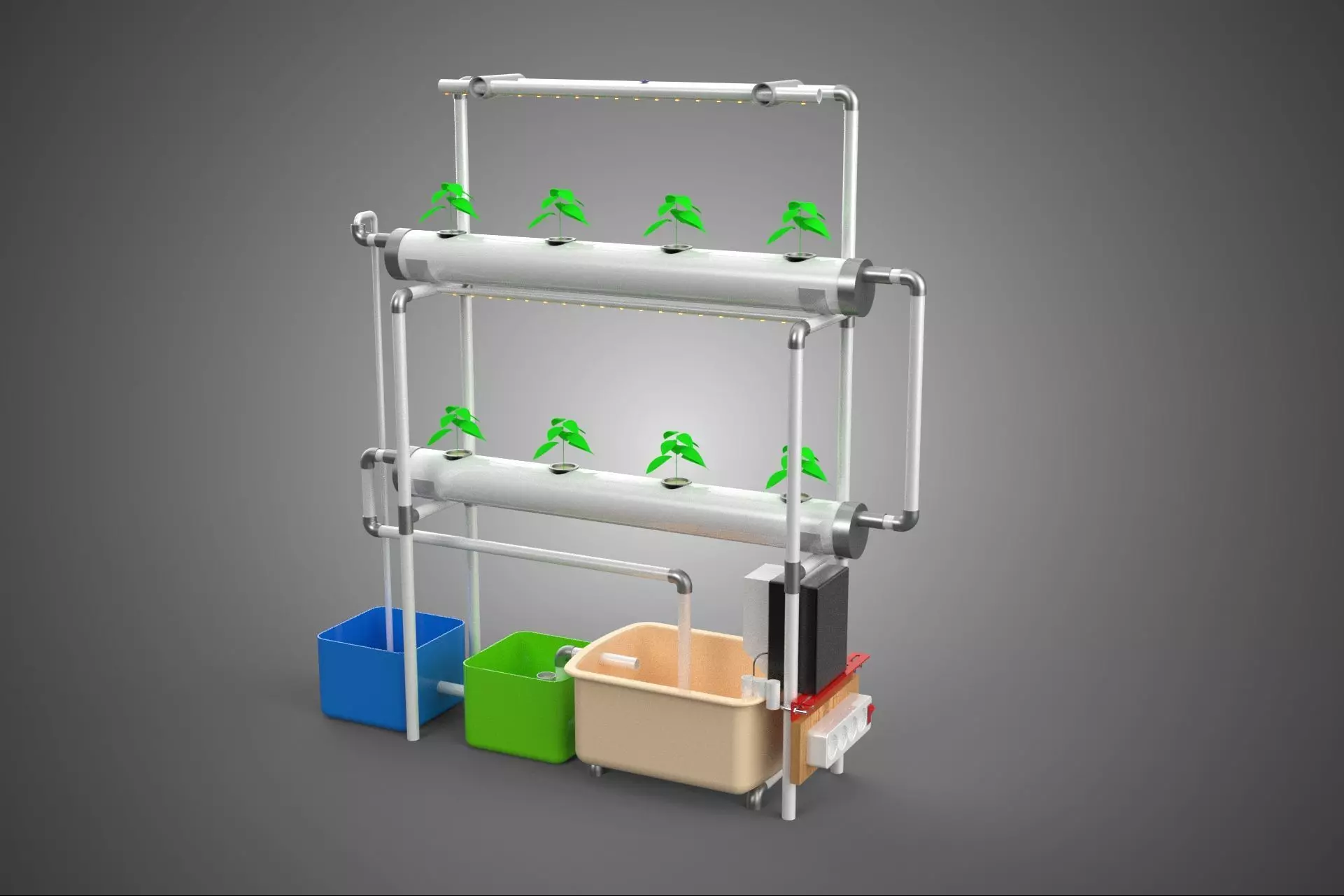 The system incorporates UV light, typically in the UVA and UVB spectrum, for several horticultural benefits. UVA light can influence plant morphology, enhancing leaf thickness and secondary metabolite production (e.g., antioxidants, flavors, pigments). UVB exposure, when carefully managed, can further induce the production of beneficial secondary compounds, acting as a natural defense mechanism for plants. Furthermore, UV radiation can contribute to pathogen control, reducing the incidence of mold, fungi, and bacterial growth on plant surfaces and in the nutrient solution, thus promoting overall plant health without chemical interventions.
