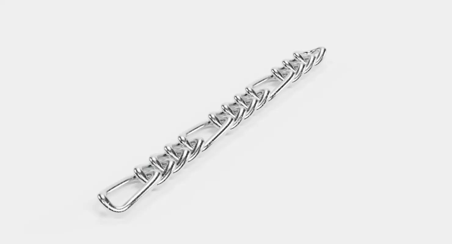 A realistic 3D model of a steel link chain featuring a distinctive figaro-style rhythm in its link arrangement. The polished steel surface reflects light cleanly while subtle scratches introduce natural material variation and visual depth. The overall look remains modern, making the chain suitable for scenes that require a metallic detail with a recognizable pattern. This link chain works especially well as a design accent, functional prop, or in industrial product, and environment-focused visuals.