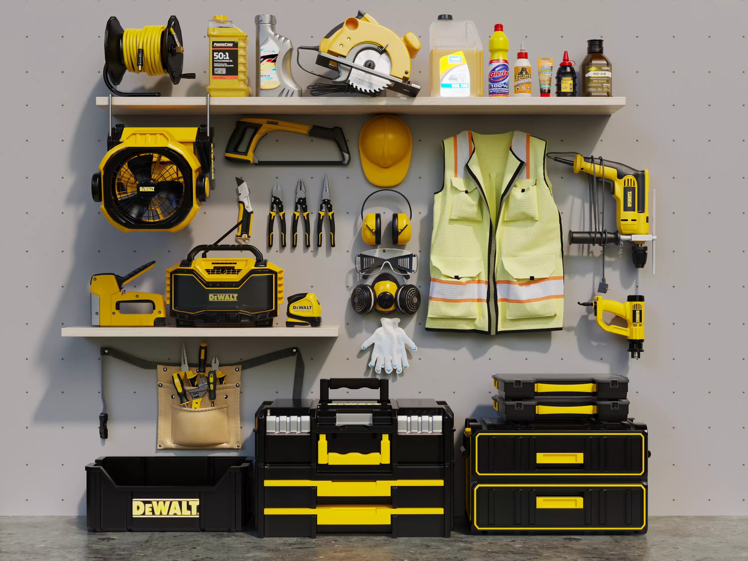 This is a comprehensive, high-quality 3D asset collection of a modern industrial tool wall. Featuring a DeWalt-inspired yellow and black color scheme, this set is perfect for architectural visualization, VR garage experiences, and high-end CG industrial environments.What’s Included in This Set:Power Tools: Cordless drills, circular saw, industrial fan, radio, and stapler.Hand Tools: Hacksaw, pliers, screwdrivers, tape measure, and various wrenches.Storage & Organization: Wall-mounted shelves, heavy-duty tool chests, storage bins, and a leather tool belt.Safety Gear (PPE): Safety vest, hard hat, earmuffs, goggles, respirator, and work gloves.Accessories: Oil bottles, cleaning supplies, and wire reels.Key Technical Features:Software: Modeled in 3ds Max with precise detail and clean geometry.Rendering: Native V-Ray materials and light setup included. Ready for photorealistic rendering.Universal Formats: Comes with .MAX, .FBX, and .OBJ formats for seamless integration into Blender, C4D, Maya, and Game Engines.Well-Organized: All objects are logically named and layered. Materials and textures are correctly mapped.Technical Specifications:Geometry: High Poly / PolygonalFormats: .max (V-Ray), .fbx, .objTextures: High-resolution PBR textures includedUnits: Metric (Centimeters)
