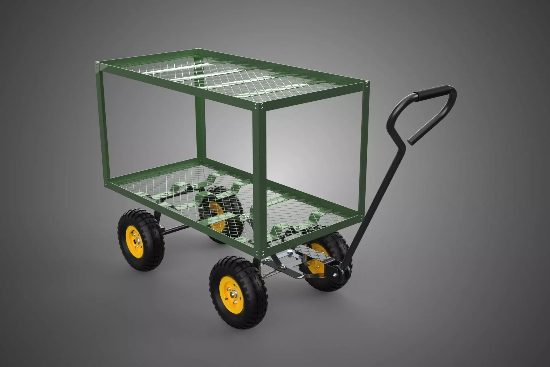 This industrial-grade double-deck turntable trolley is engineered for heavy-duty material handling in nursery, garden, and warehouse environments. Constructed from high-tensile powder-coated steel, the cart features two spacious decks, providing ample surface area for transporting plants, equipment, or supplies. Its defining feature is the turntable steering mechanism, which allows for an exceptionally tight turning radius and superior maneuverability even when fully loaded. The pneumatic tires are designed to traverse uneven terrain such as gravel, grass, or soil without sinking or losing stability. Each tier is reinforced to support significant weight, making it an essential tool for commercial landscaping and horticultural logistics. The ergonomic handle is integrated with the steering linkage, ensuring effortless control and reduced operator fatigue. The open-frame design facilitates easy loading and unloading from all sides, while the mesh or solid deck options prevent smaller items from falling through. This robust utility cart is built for longevity, resisting corrosion and mechanical wear in demanding outdoor conditions. It serves as a versatile solution for professional gardeners and industrial operators seeking efficiency and durability in a multi-tier transport platform.
