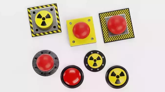 A collection of seven distinct industrial push buttons, each with unique base shapes, colors, and safety markings. This set covers standard, mushroom, and hazard-marked designs, providing a versatile toolkit for emergency controls, safety panels, and technical interfaces. Each model features original detailing, robust construction cues, and high-contrast colors to clearly communicate their function in industrial or simulated environments.
