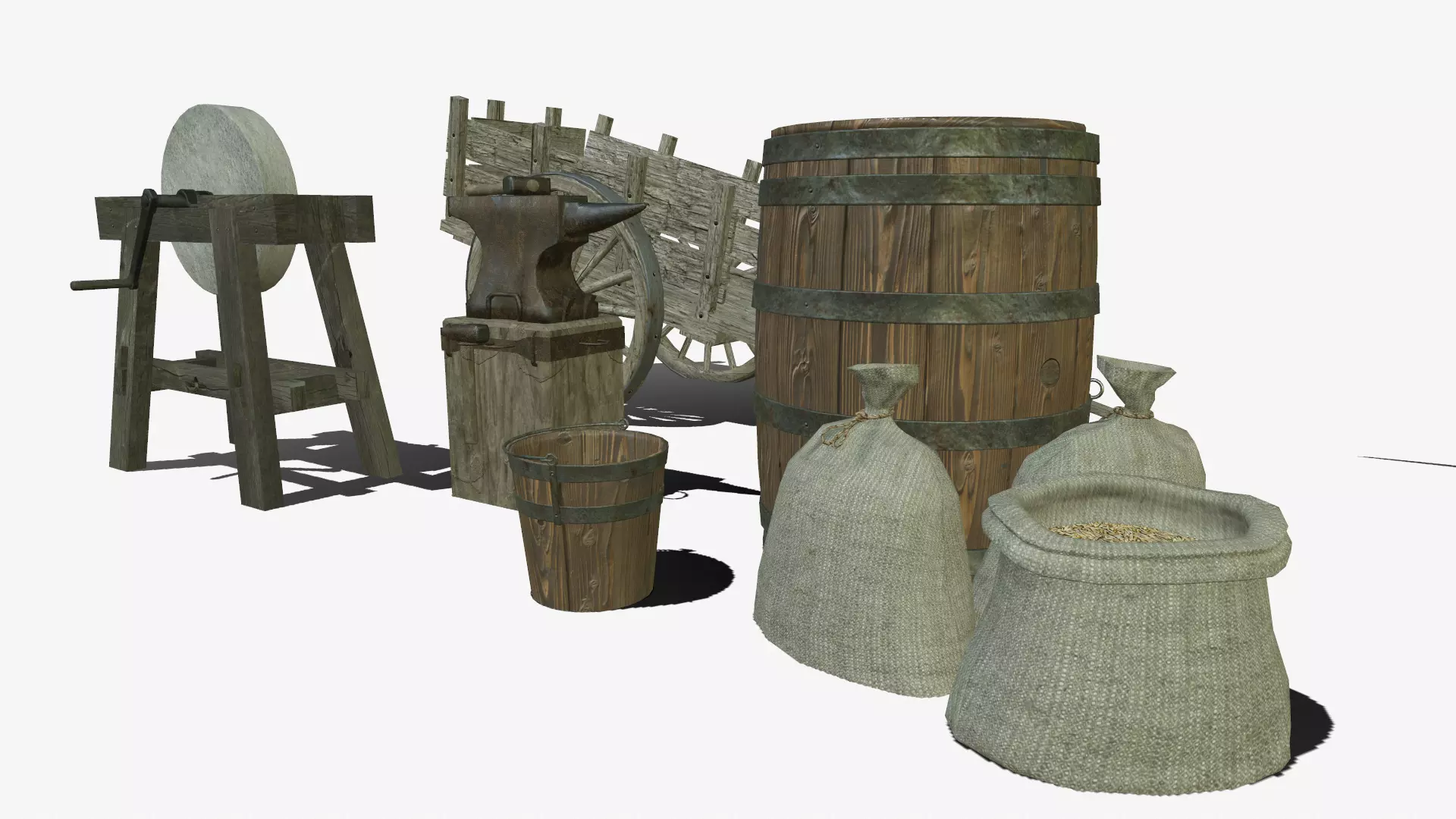 Contains:CartAxescytheforkrakebarrelgrindstoneanvilsackshovelbucketchopping block