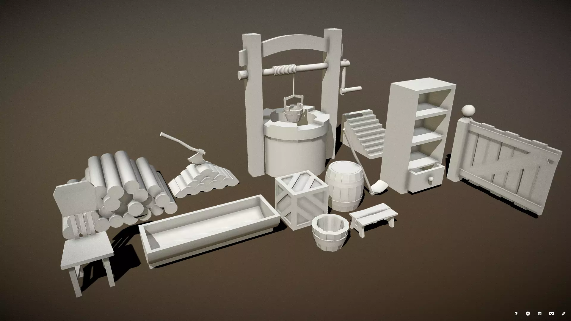 AxeBarrelBucketCabinetCheirWoodpileCut WoodpileDrinking TroughFanceHoeStairStoolWellWood Box