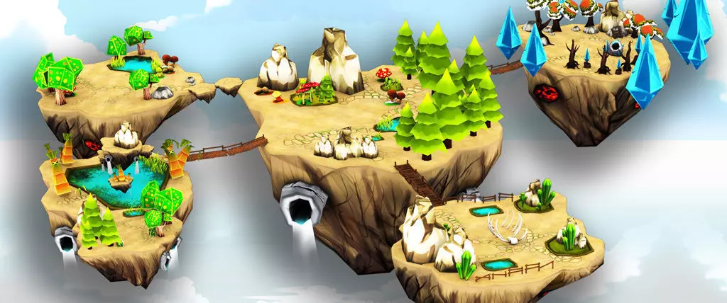 Feature •100+ optimized 3d models includes : floating island, trees, mushrooms, bridge, Fence , Stone, crystals, , rocks, grass, stairs, fossils bones, pond land, and other....• 4 demo scenes: Graden Forest, Rift, Desert,Island snow• Supports all player platforms in the mobile .All models are optimized and use shared texture with four styles : forest , Rift , Desert , Snow