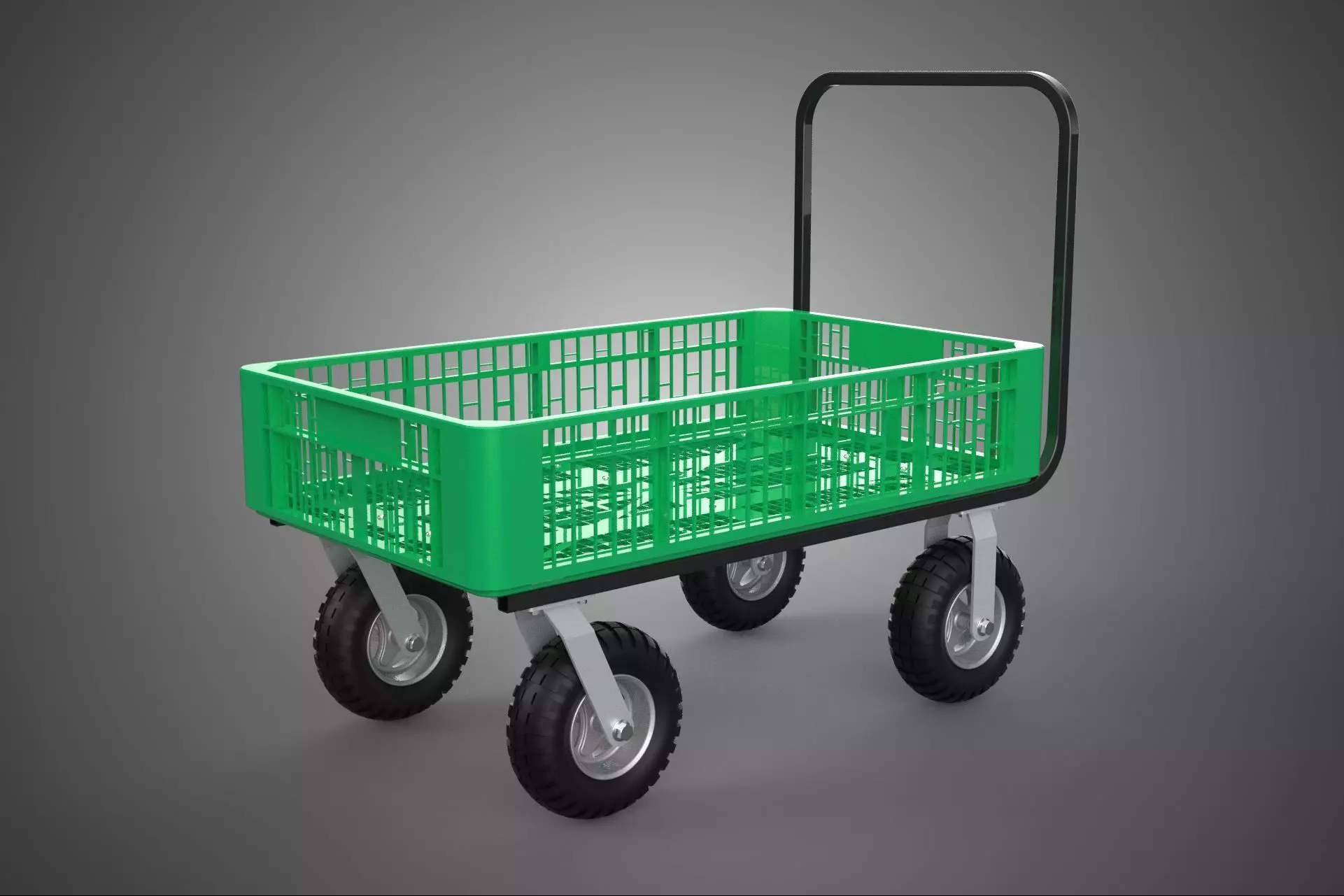 This 3D model represents a durable utility wagon designed with a steel frame and a plastic mesh deck structure. The model features a practical cart design commonly used for transporting crates, tools, plants, and various materials in farms, gardens, warehouses, and industrial environments.