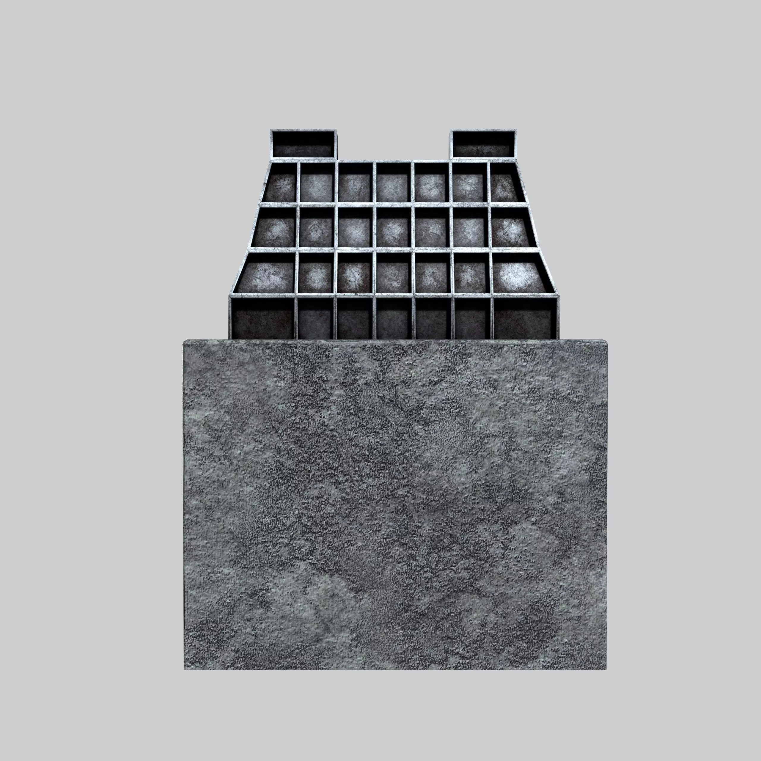 This asset represents the robust concrete and steel support structure used to securely hold molten metal ladles during pouring, maintenance, or transportation operations.