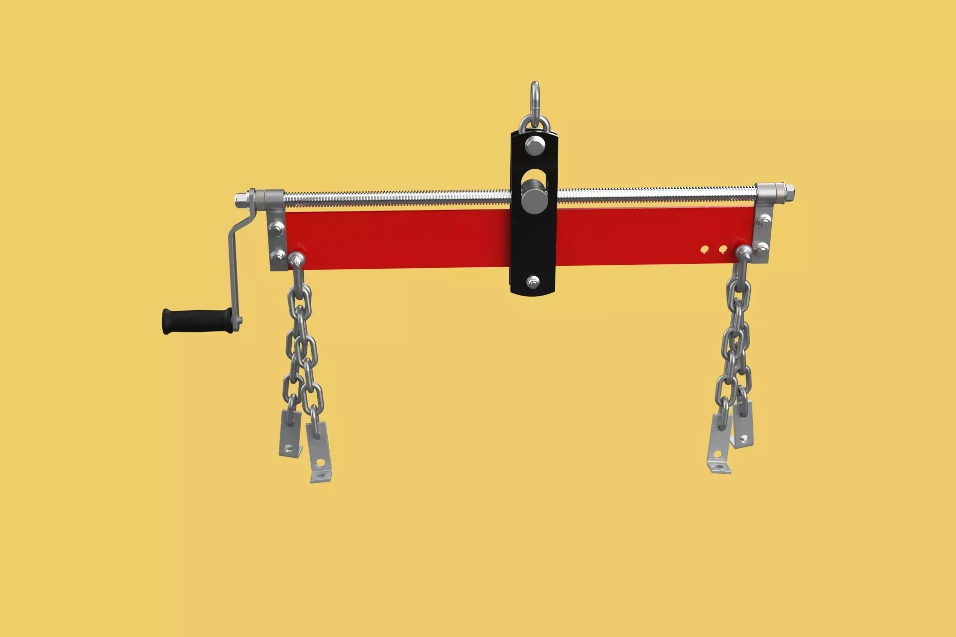 Engine Hoist / Crane Compatibility: Designed to easily attach to the hook of an engine hoist or shop crane.Load Balancing: The core feature is its ability to adjust the center of gravity of the load. It typically achieves this through:Adjustable Screw Mechanism: A common design uses a threaded rod with a handle. Turning the handle shifts the position of the lifting chain/hook along the bar, effectively tilting the attached engine.Multiple Chain Attachments: Features several chains or straps that attach to different points on the engine, distributing the weight.Leveling Capability: Allows the operator to precisely tilt the engine forward, backward, or side-to-side, ensuring it is perfectly level or angled as required for alignment during installation or removal from tight engine bays.Heavy-Duty Construction: Built from strong, durable steel to securely support the weight of an engine (typically rated for capacities matching common engine hoists, e.g., 750 kg, 1500 lbs, 2000 lbs).Secure Attachment Points: Features robust chains or straps with heavy-duty hooks that securely attach to engine mounting points or lifting brackets.User Control: Provides easy and precise manual control over the tilt and balance of the engine, allowing for fine adjustments during delicate operations.Benefits: