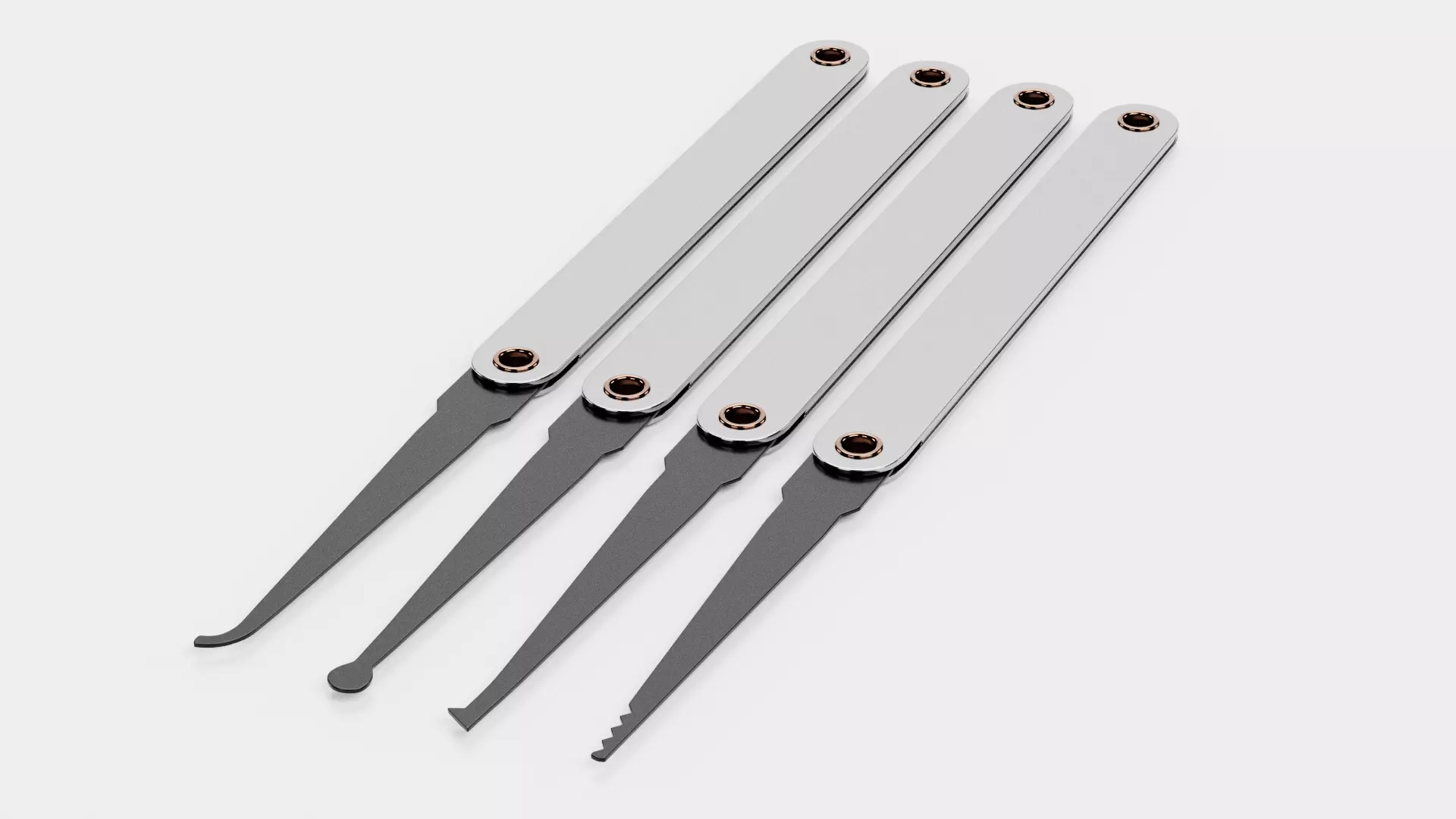 A set of four precision lockpick tools, each featuring a different tip type. The set includes a saw rake, diamond tip, ball tip, and short hook, covering a range of common lockpick profiles. All tools share a consistent slim, flat handle design with a darker metal tip, creating a cohesive look across the set. The surface finish includes light micro-scratches for added realism. Each shape is clearly defined and easy to read, making the set suitable for both close-up and wider shots. Works well as a ready-made lock picking kit or as individual props within a scene. Suitable for cinematic scenes, prop collections, or detailed visualization.
