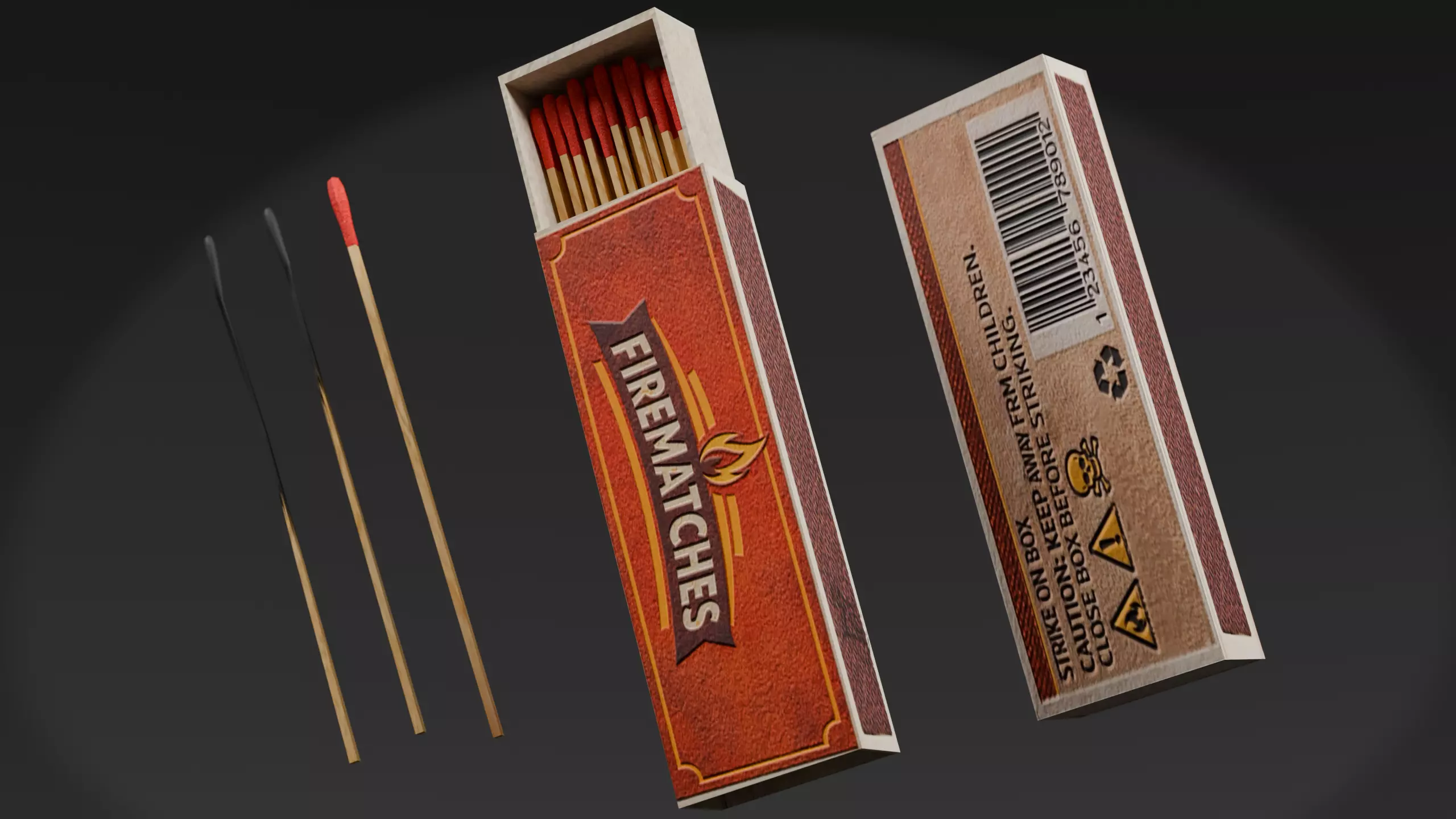 This asset includes a larger matchbox version with long wooden matches, suitable for survival, camping, industrial and environment scenes.