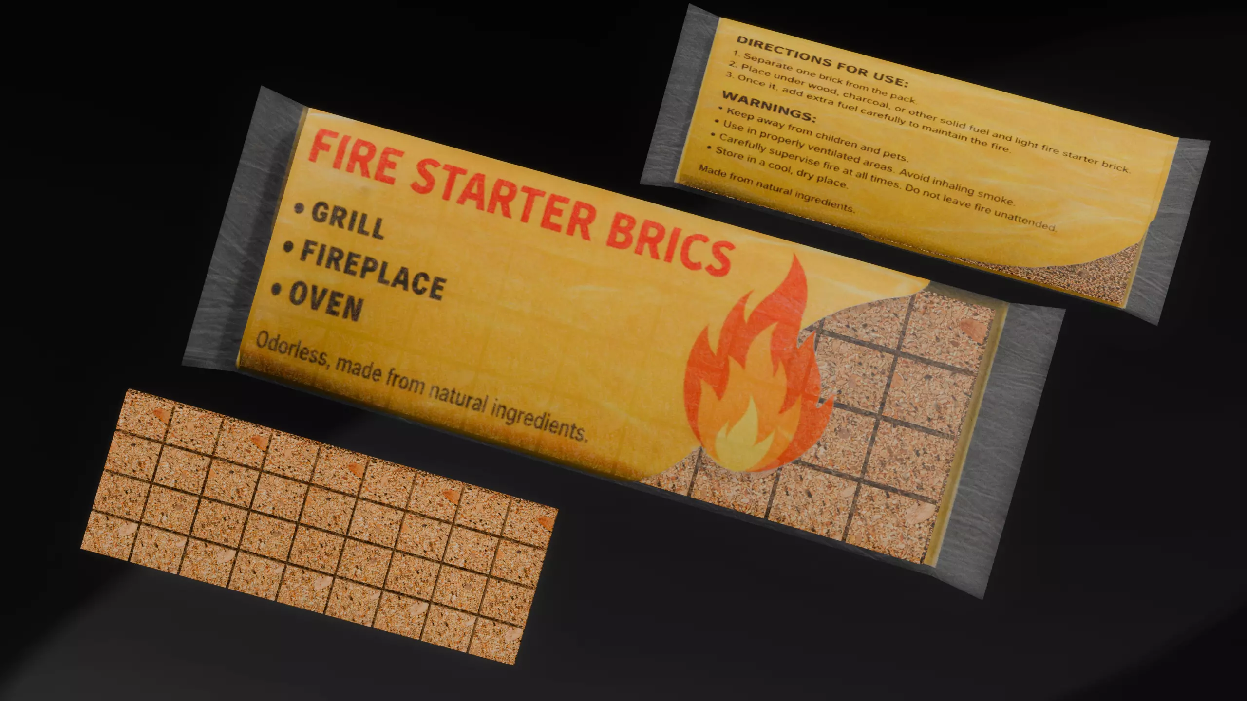 Game-ready fire starter bricks asset designed for survival, camping and outdoor environments. The model features realistic fuel blocks with transparent plastic packaging using an alpha workflow. Transparency has been tested and works correctly in Unity.Optimized low poly geometry suitable for real-time applications, including games, simulations and interactive projects.
