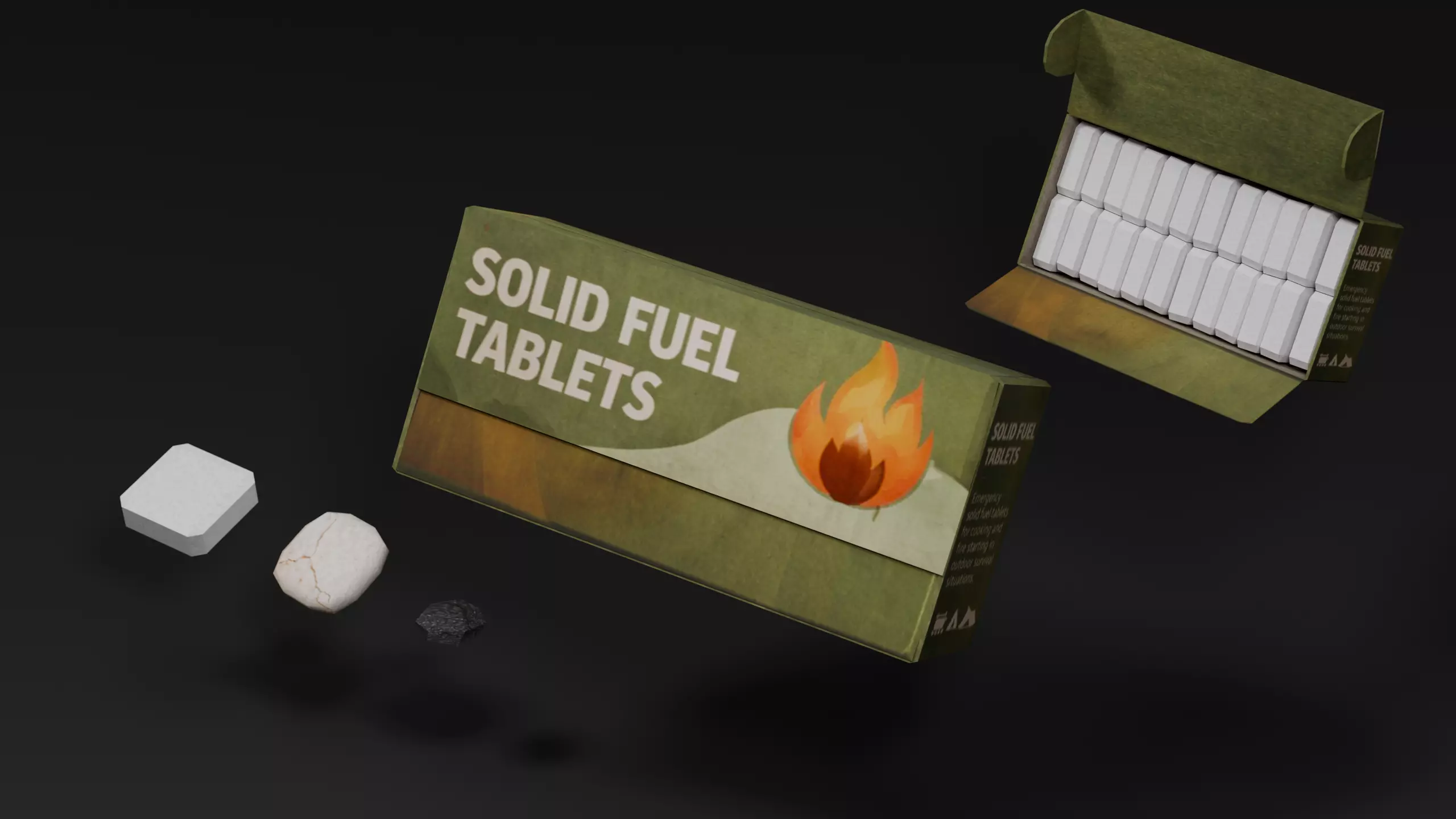 Game-ready solid fuel tablets designed for survival, camping and outdoor environments. This asset includes both closed and open packaging variations, along with multiple content arrangement options for flexible scene setup.The tablets feature three burn stages, allowing you to represent unused, partially burned and fully burned states in your project.Optimized low poly geometry and clean UV layout make this asset suitable for real-time applications, including games, simulations and interactive projects.
