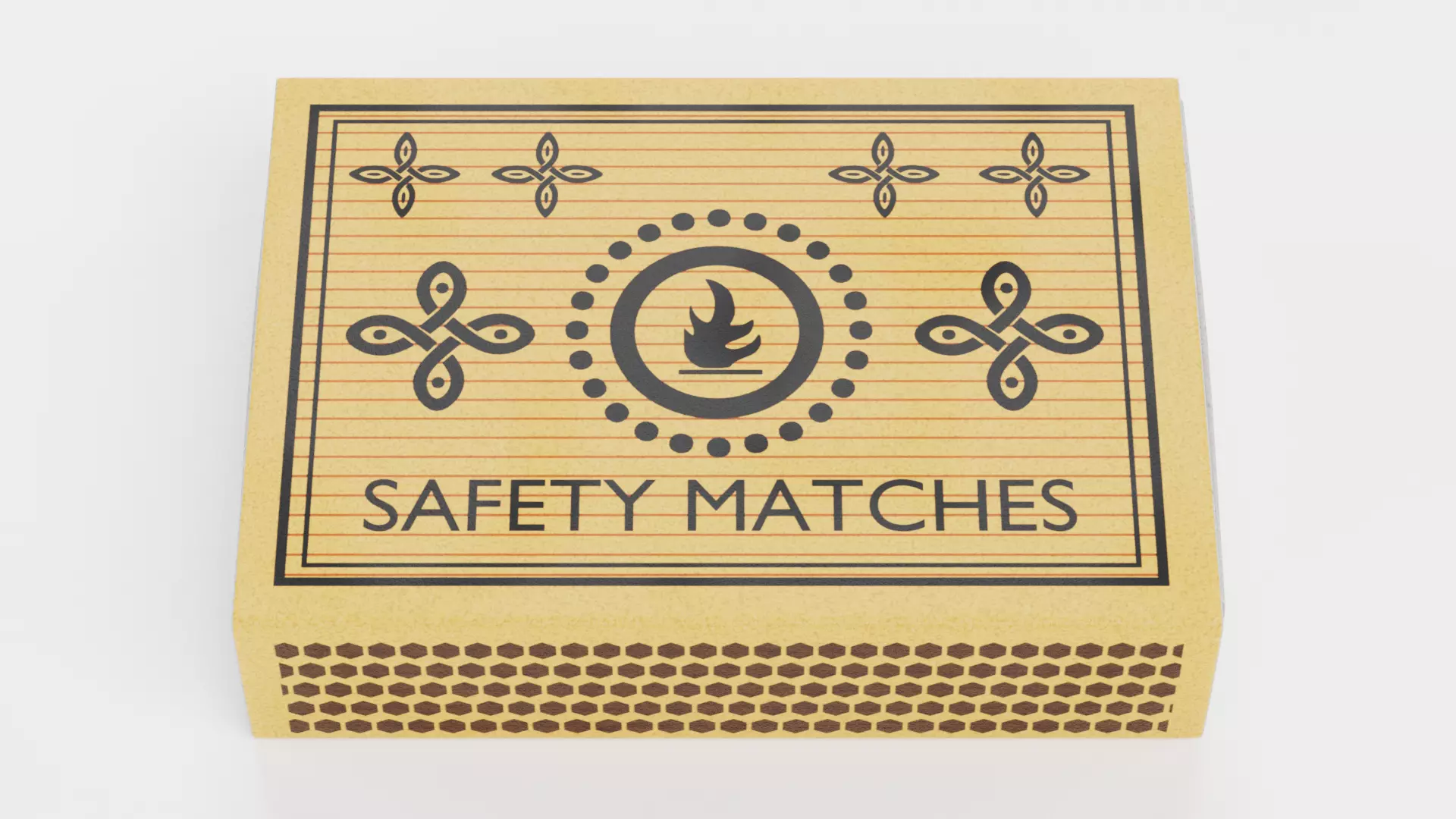 A photorealistic 3D asset of an empty matchbox with a custom, brand-neutral design. The box keeps the classic sliding tray construction, complete with a finely detailed striker strip on the side and a recycled-paper inner compartment. The model features an original custom cover with a dark-yellow striped base, black pictograms, and a bold SAFETY MATCHES label. The design keeps a** brand-free look** while adding a more stylized, recognizable visual identity.