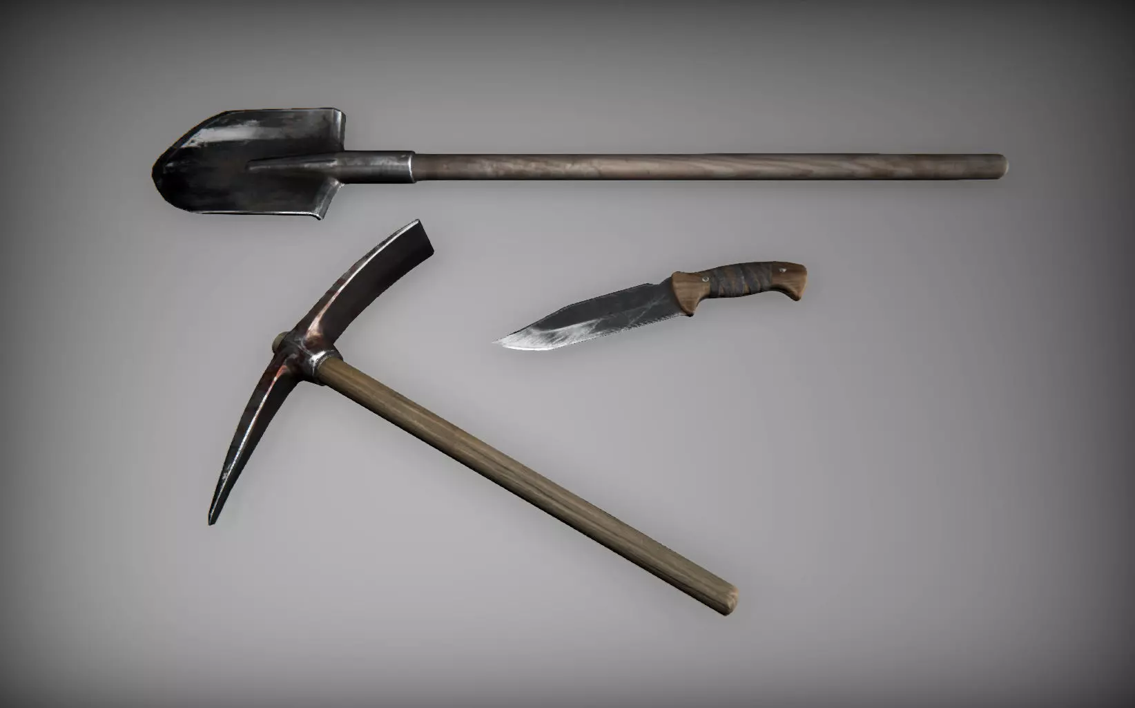 Game assets. Metall shovel, metall pick, metall simple knife. All what you need to dig your own hole in ground.Pick - 600 trisKnife - 926 trisShovel - 566 trisPBR textures
