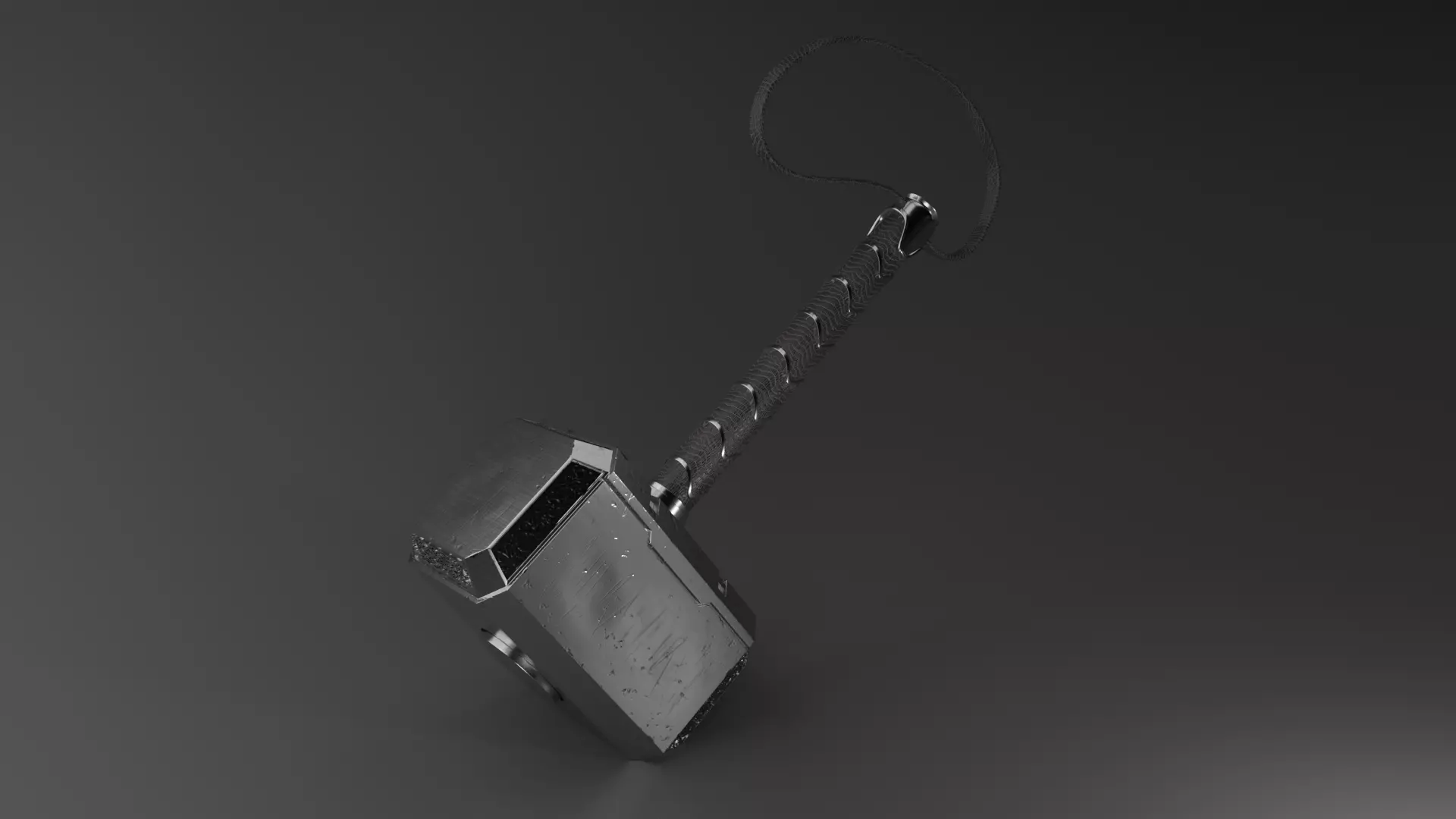 A 3D model of 'mjolnir' the hammer of thor with a leather handle, a steel top with dents and scratches on it.