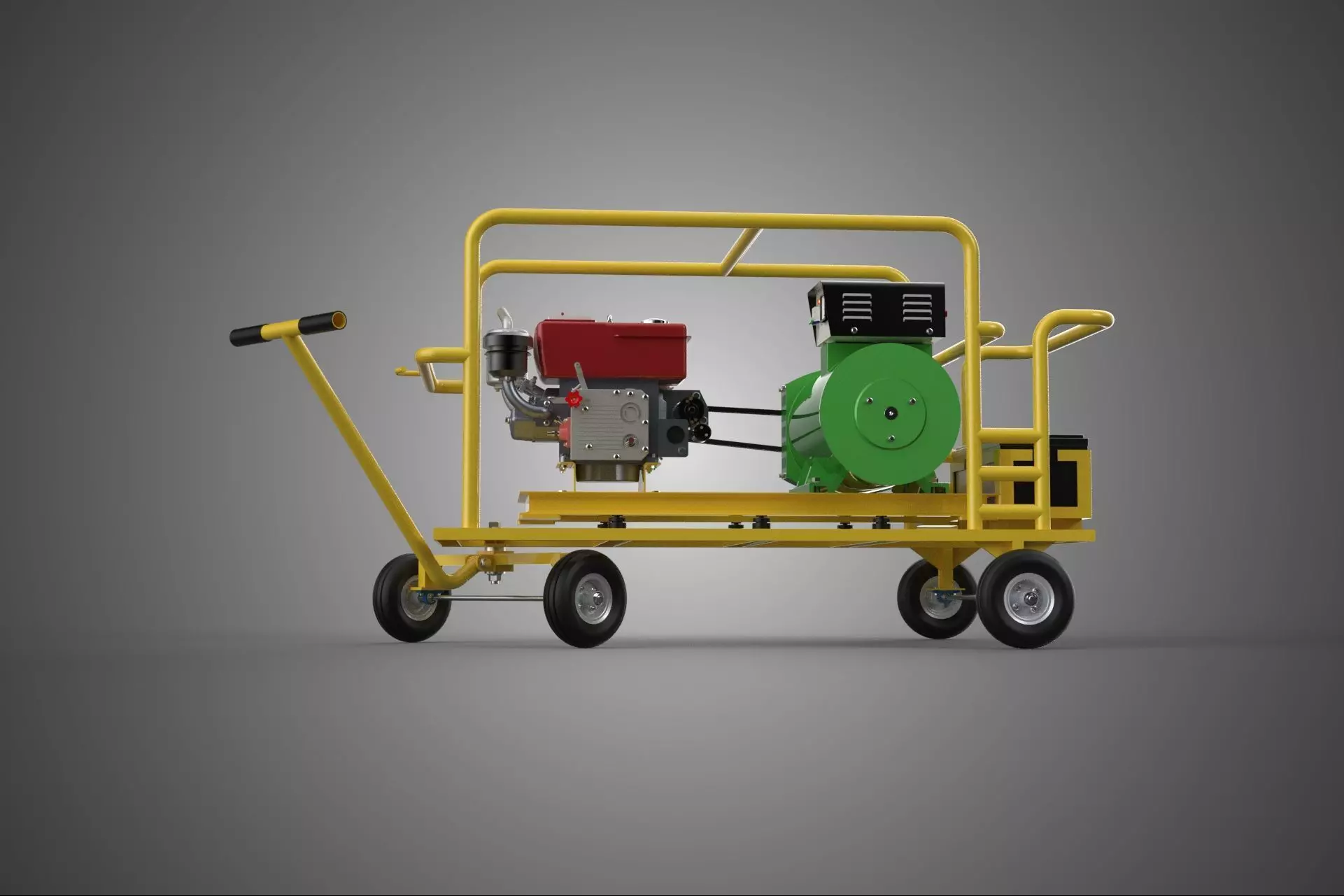KEYWORDS: Portable Power, Diesel Generator, Electric Start, Mobile Unit, Wagon Cart, Push-Pull, Industrial Grade, Temporary Power, Prime Mover, Alternator, Compression-Ignition, Site Equipment, Construction, Emergency Backup, KVA Rating, Low Speed Transport, Maneuverability, Chassis, Heavy Duty, Fuel Efficiency, 12V System, Glow Plugs, Articulated Axle, Outdoor Events, Utility Cart, Power Supply, Relocation, Standby Power, Localized Power, Generator Set.