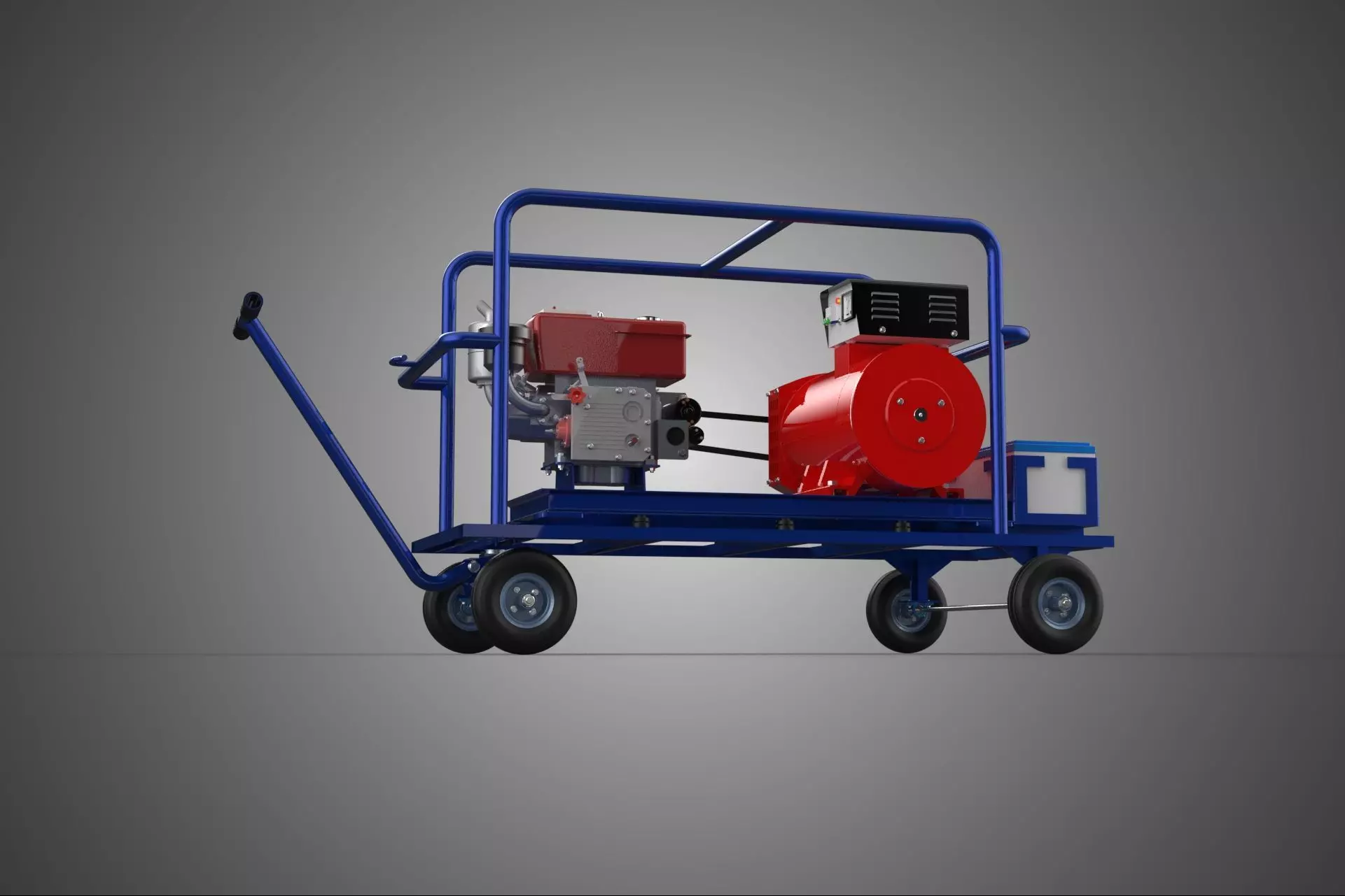 KEYWORDS: Diesel Generator, Genset, Mobile Power, Push Pull Handle, Wagon Cart, Portable Electricity, Industrial Generator, Standby Power, Manual Transport, Heavy Duty Chassis, Engine Alternator, AC Power, Synchronous Generator, Automatic Voltage Regulator, Construction Site Power, Emergency Power, Remote Power Supply, Small Scale Generation, Ergonomics, Operational Mobility, Fuel System, Sound Attenuation, Power Generation Unit, Casters, Pneumatic Tires, Utility Maintenance, Load Distribution, Vibration Dampening, Self-Contained Unit, Mobile Trolley.