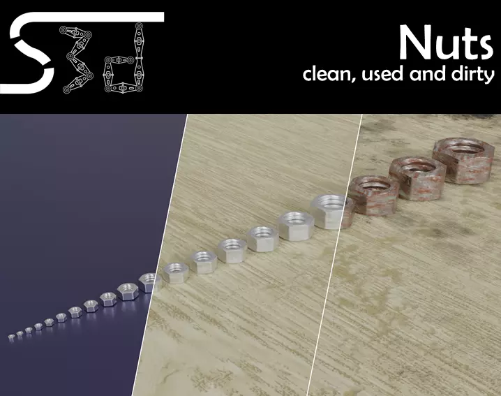This package contains Nuts in 20 different sizes, each nut comes with three materials: clean, used, and dirty. Because of that, the nut can be used in many different environments, e. g. a workshop (used), a factory (clean), or a game where you have a dirty environment.