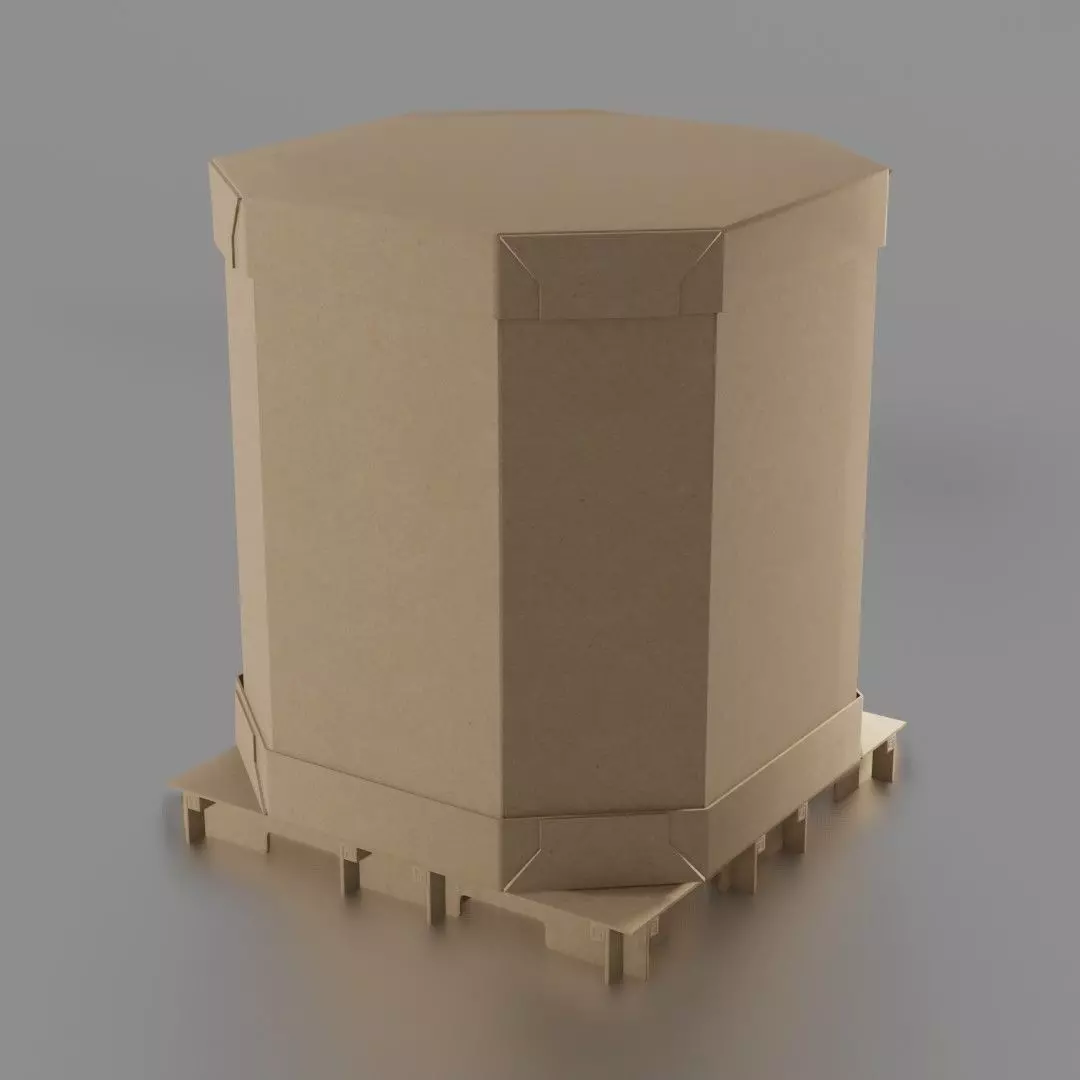 This highly detailed 3D model represents an Octabin, a large octagonal cardboard bulk container used in industrial logistics and packaging. The model includes a detachable lid, inner structure, and base pallet, allowing for full modular control and animation. Ideal for product visualizations, factory scenes, or packaging simulations.