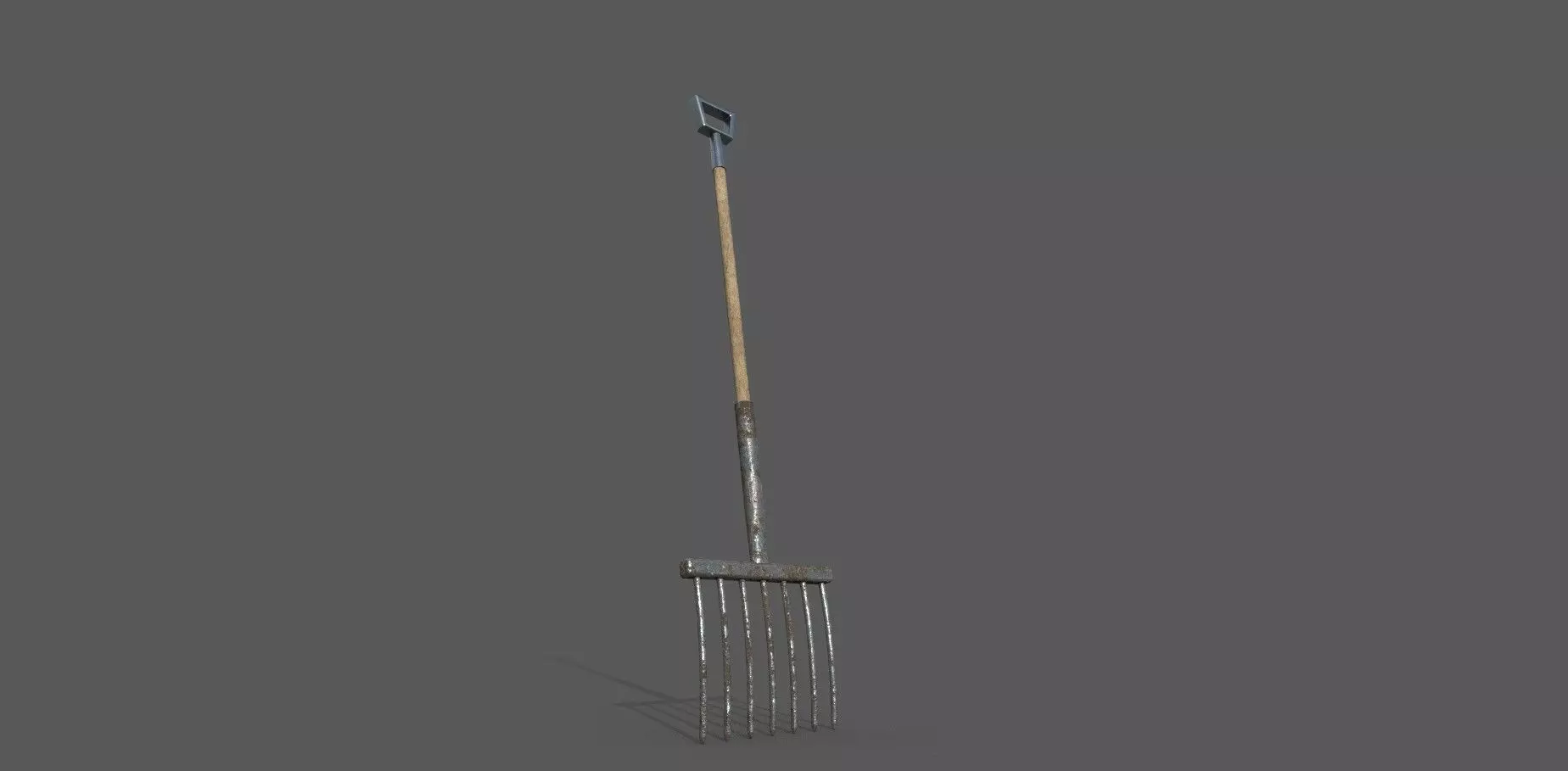 A pitchfork is an agricultural tool with a long handle and long, thick, widely separated pointed tynes used to lift and pitch or throw loose material, such as hay, straw or leaves. They are usually made of steel with a long wooden handle, but may also be made from wood, wrought iron, bamboo, or alloy. In some parts of England a pitchfork is known as a prong and, in parts of Ireland, a sprong refers to a four-pronged pitchfork.format included:Mb.Obj.Fbxoriginally created with maya 2019 and textured with substance painter.