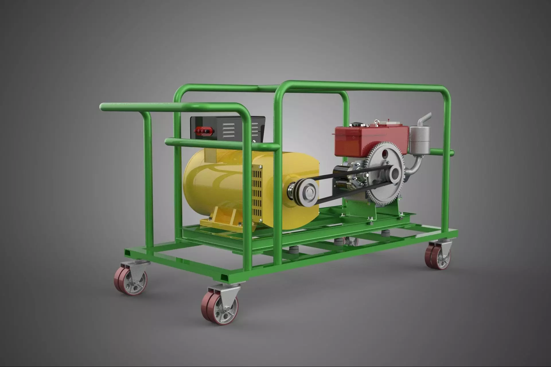 The design of caster-wheeled Gensets emphasizes ergonomic handling and stability. To mitigate the high vibrational forces inherent to diesel engines—especially single or two-cylinder units common in smaller portables—the engine and alternator assembly are mounted on anti-vibration mounts (AVMs), often using rubber isolators or springs, before being affixed to the base frame.