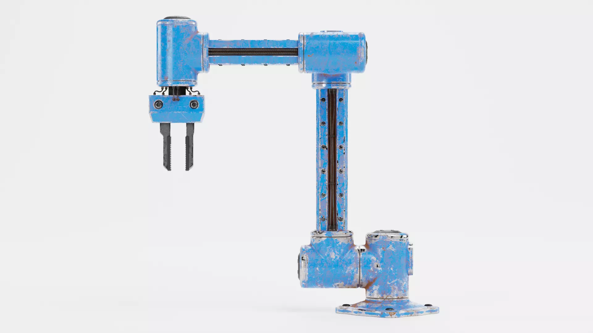 Universal, brand-neutral industrial robotic arm equipped with a simple two-finger gripper, presented with a worn, used surface finish. Subtle scratches, scuffs, and operational wear are baked into the PBR textures to give the model a long-service, production-line feel. The arm remains fully rigged in Blender with constraint-based controls, offering a precise representation of a generic articulated robotic system with a utilitarian gripping tool.