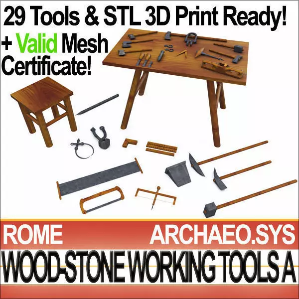 29 Hi-DEF detailed Models. Reconstruction of Ancient Rome Wood Stone Working Tools according to Science/Archaeo Data. All Models with Valid Mesh Certificate and STL 3D print ready. Real World Scale. Only Quads [C4D; OBJ] & Tris [VUE;3DS]._________________________________29 3D Models Collection!Real World Scale Model [SmartCgArt Real World System]. Quads [C4D; OBJ] & Tris [VUE;3DS].STL 3D Print Ready Mesh Files with Mesh Validation Certificate. Hi-DEF.