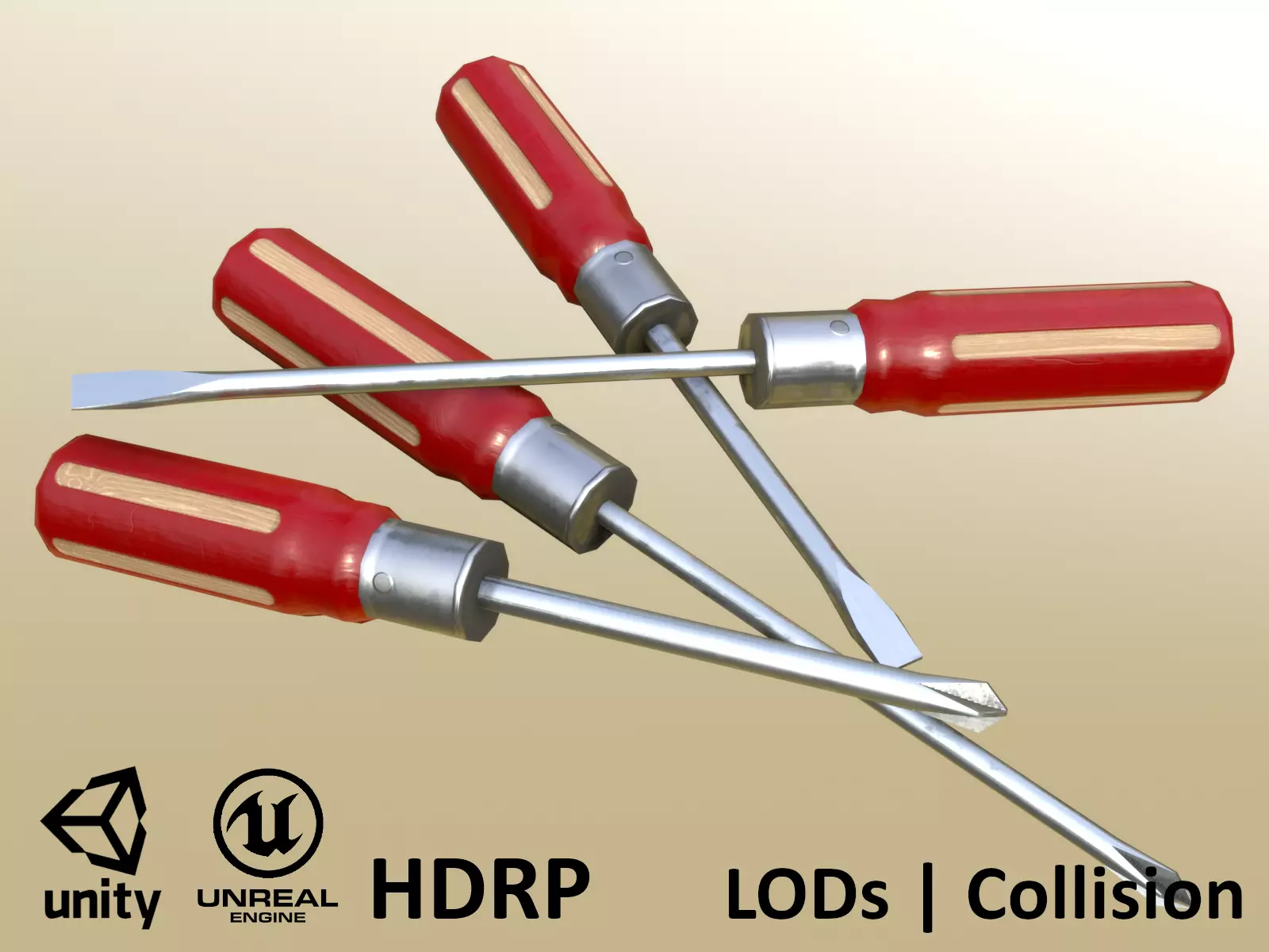 Scredrivers 3D model - slotted and cross-slotted, short and long - game-ready - highpoly on lowpoly - modeled with Blender 2.82, textured carefully with Substance Painer.Rendered with Eevee (also with different HDRIs). 4 single objects. One material for all of the objects. UV mapped to cover the most of UV space.Metric units.