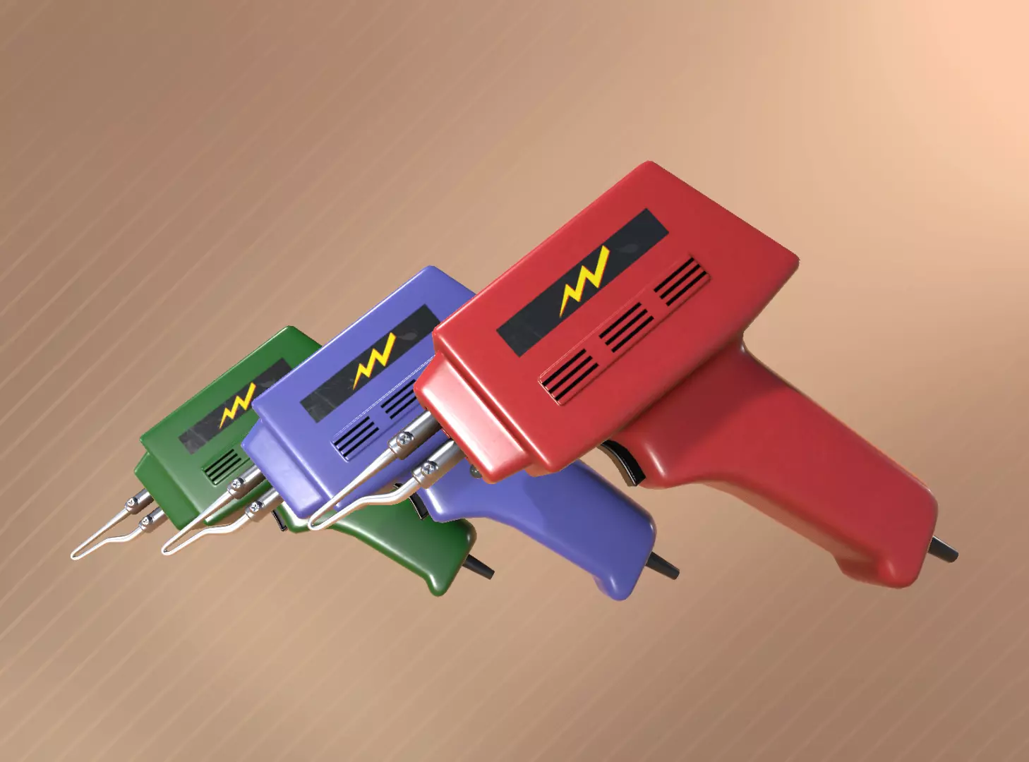 Set of four detailed soldering guns in three color variants (red, green, blue), comes as cordless model variant and three resting variants with coiled cable – lowpoly PBR (specular and metalness) models.