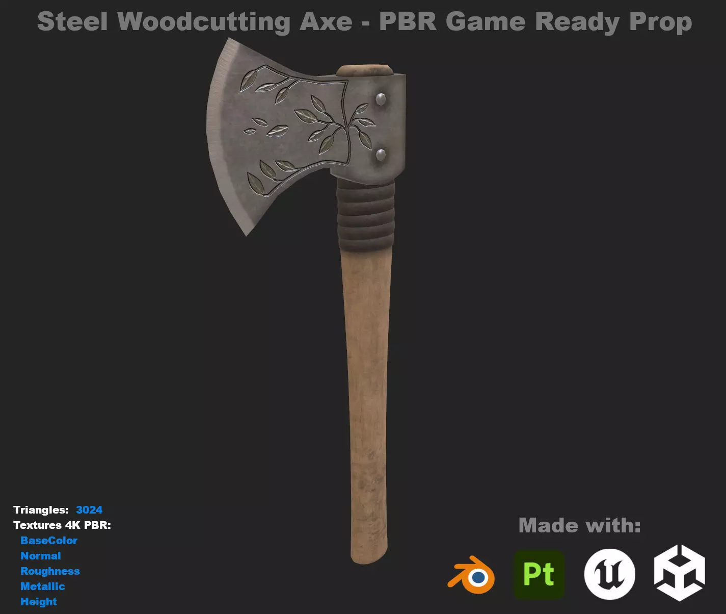 This asset features a clean and optimized mesh with carefully crafted details, including a worn metal blade and a wooden handle with wrapped grip, giving it a believable and practical look suitable for survival, medieval, and outdoor settings.