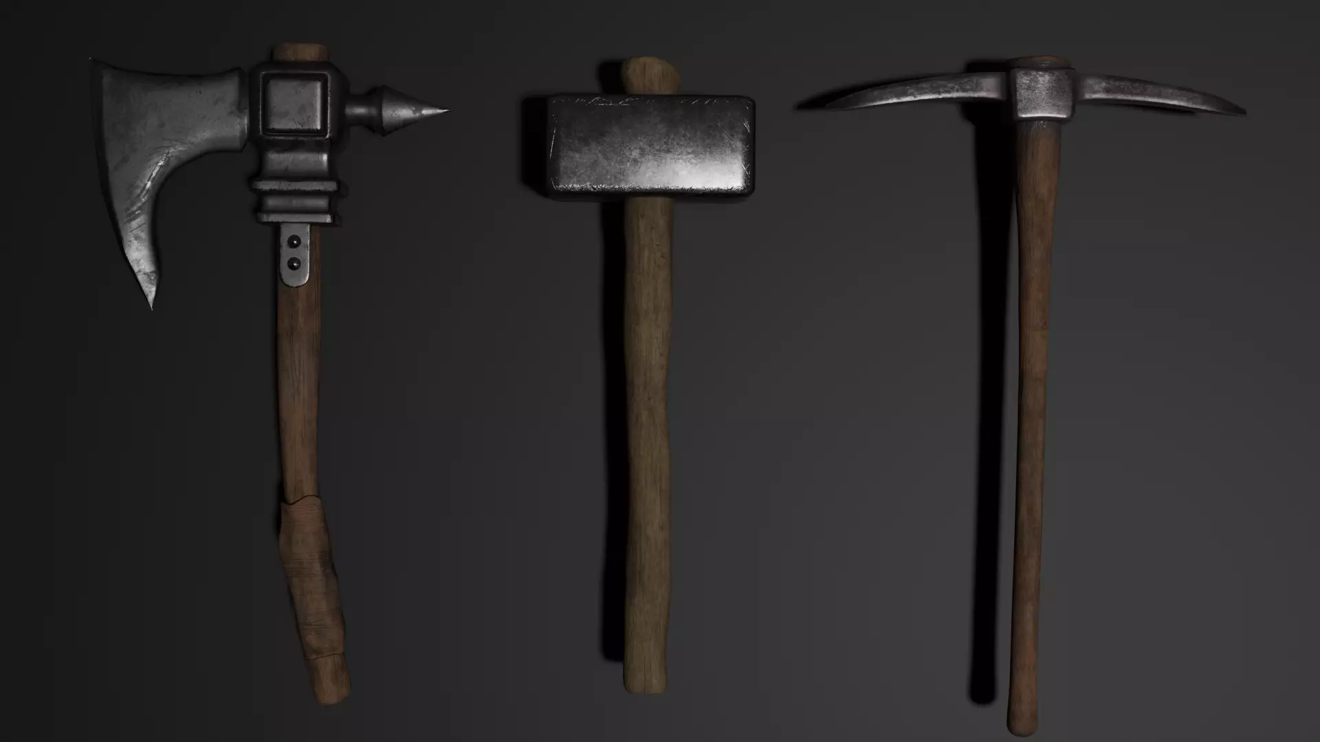 Total Polygon Count: 36,322Axe: 27,216 polygonsHammer: 5,235 polygonsPickaxe: 3,872 polygonsTexture Resolution: 2K textures includedFormats Included: .blend, .fbx, .obj, .mtl