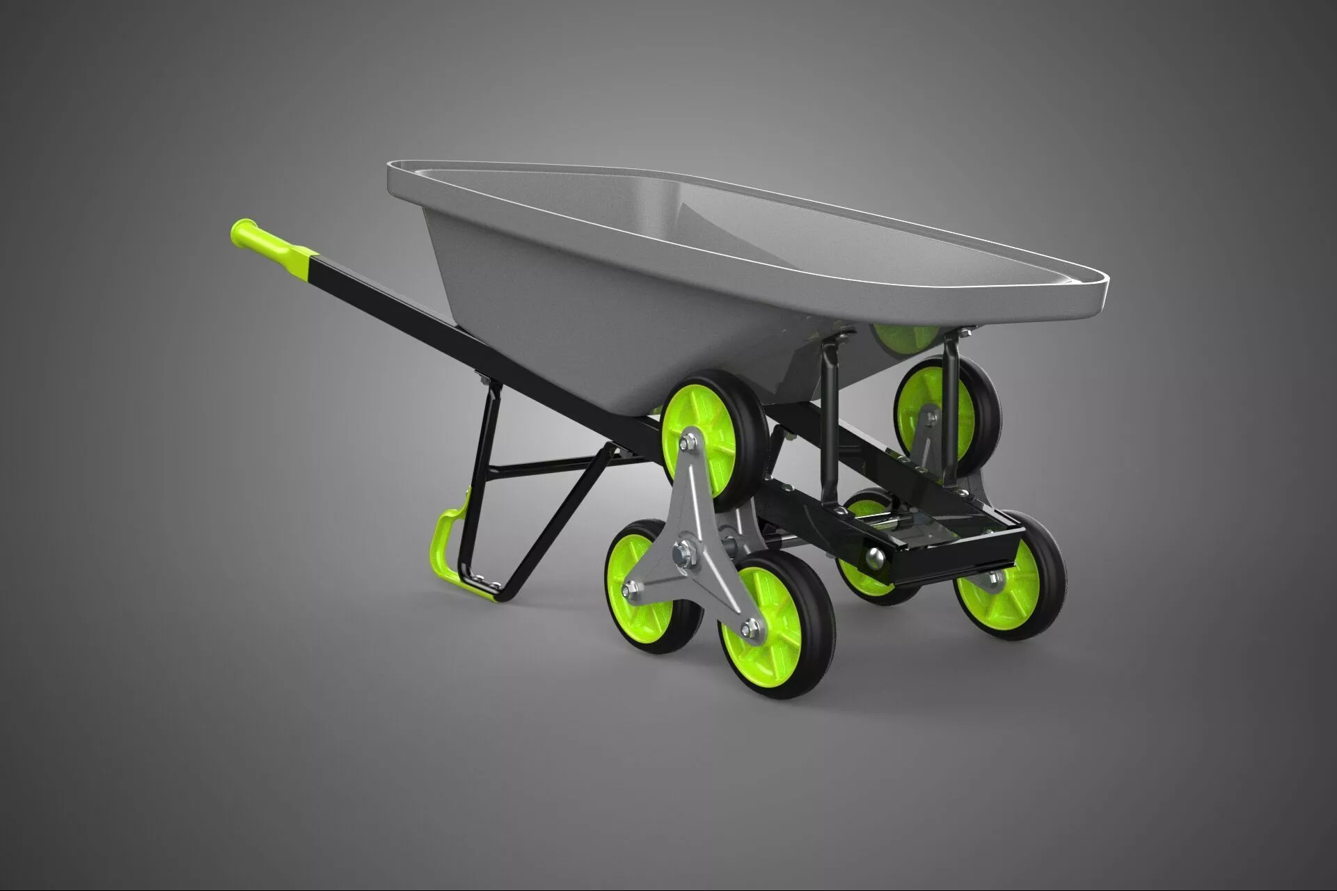 This high-fidelity three-dimensional model depicts a triple-wheel stair-climbing wheelbarrow, a sophisticated material handling implement designed to overcome the limitations of traditional single-wheel carts. The defining characteristic of this device is its tri-star wheel configuration, which consists of three independent wheels arranged in a triangular rotating assembly on each side of the main axle. This mechanical design allows the unit to pivot seamlessly over stairs, curbs, and uneven terrain by maintaining continuous surface contact and distributing weight more effectively during vertical transitions. The model features a robust chassis constructed from heavy-duty powder-coated steel tubing, ensuring long-term durability and resistance to structural fatigue under significant loads. The large-capacity hopper or tray is modeled with precision to reflect standard industrial volumes suitable for transporting soil, masonry, or logistics parcels. Ergonomically positioned handles with slip-resistant grips are included to demonstrate the leverage points necessary for safe operation during ascent and descent. This asset is particularly valuable for architectural visualizations, industrial safety training simulations, and logistical planning scenarios where navigating complex vertical environments is a primary focus. Every component, from the reinforced struts to the tread patterns on the non-marking rubber tires, has been crafted to provide a realistic representation of modern specialized transport equipment.