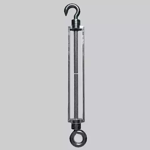 This model represents a classic hook-and-eye turnbuckle, commonly used for tensioning cables, wires, ropes, and structural supports.It features a threaded central body with opposing threads, forged hooks, and realistic metal wear for true-to-life appearance.