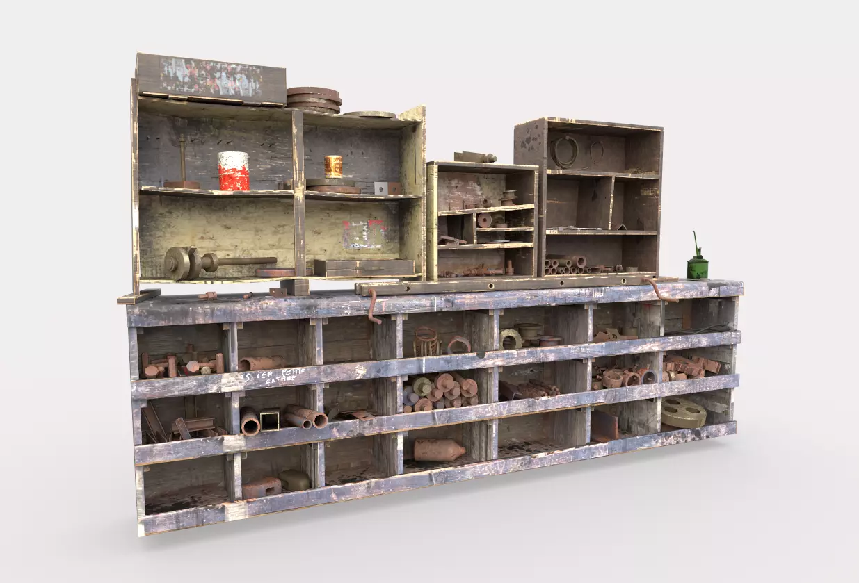 Model of Used Workbench with parts . Model is very realistic.It has 5 PBR material.Maps are diffuse-specular-glossiness-height and normal. Model's textures has two sizes; 4096x4096-2048x2048. All maps are PNG formats .UE4 converts (4096x4096) are included.