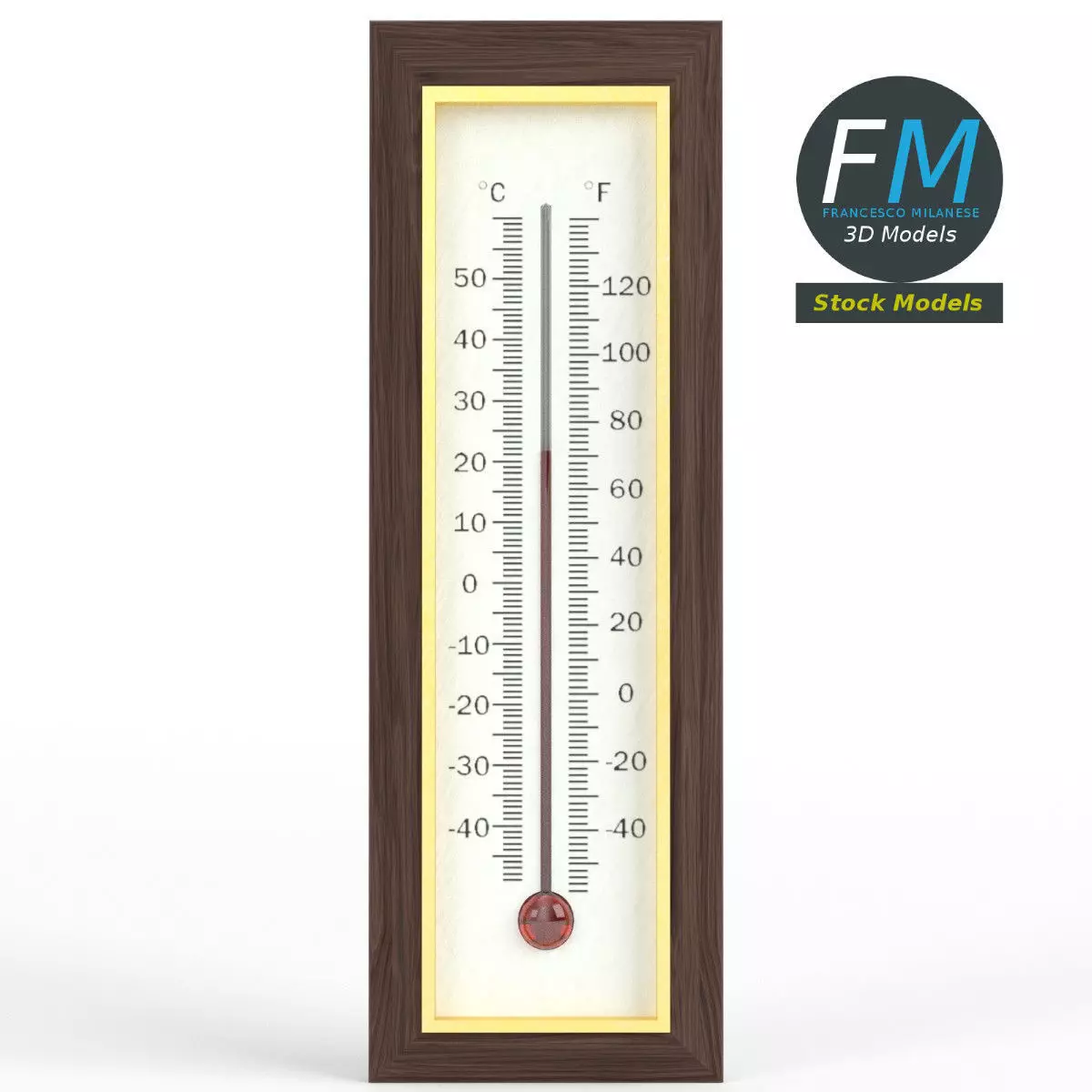 Wall thermometer 3D Model. 3 individual objects (base, glass, liquid), each one with its own non overlapping UV Layout map, Material and PBR Textures set. The back side is not modelled, so you'll see the same textures of the front side. Production-ready 3D Model, with PBR materials, textures, non overlapping UV Layout map provided in the package.