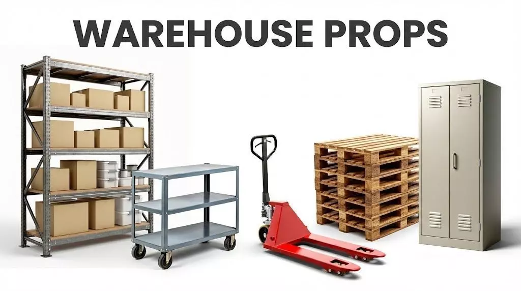 • Wooden Pallet Stack• Wrapped Cargo Pallet• Industrial Shelving Rack• Hand Pallet Jack• Metal Storage Locker Cabinet• Industrial Rolling Utility Cart