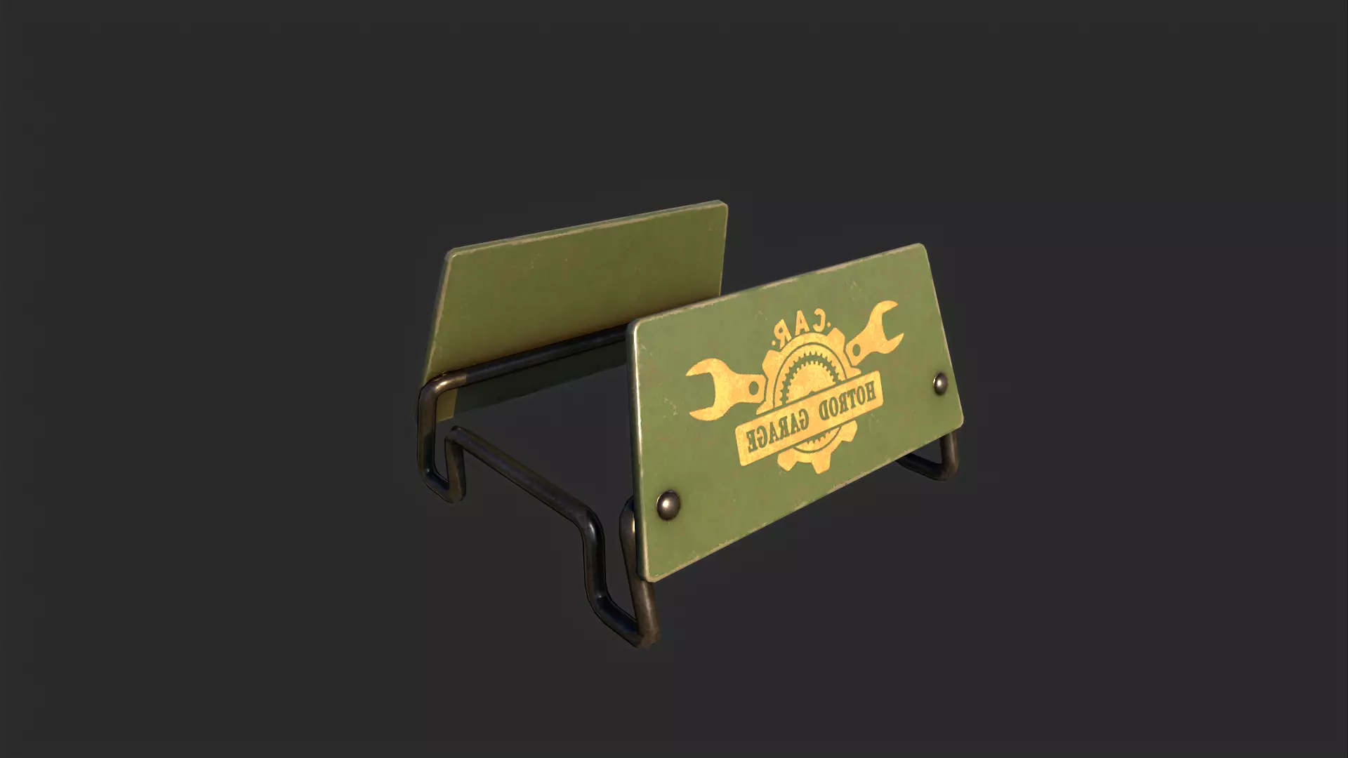 Game-ready 3D model of a retro-style license plate holder with a decorative Hotrod Garage print, ideal for automotive scenes, workshops, or themed environments.