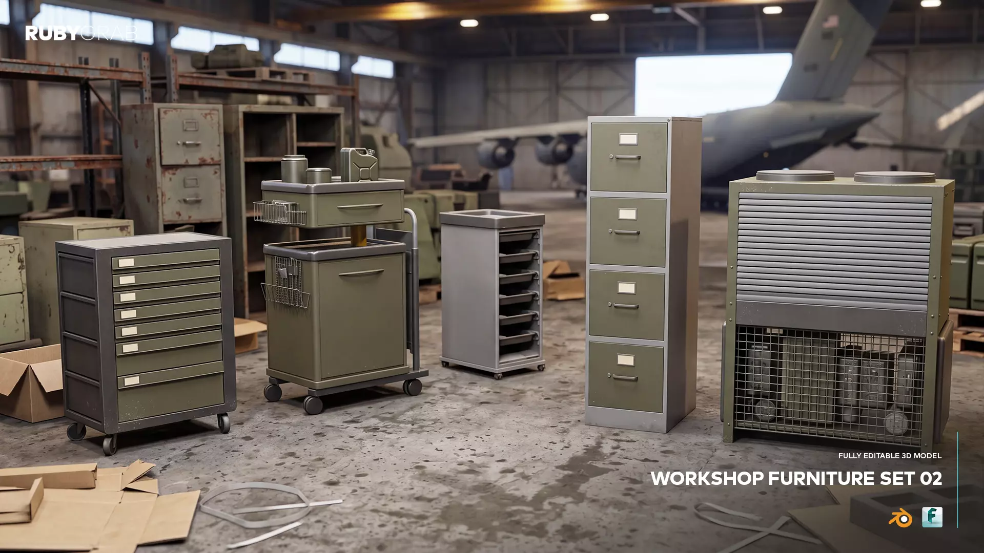 This is a high-quality, fully editable 3D model set of modern workshop furniture. The pack includes six detailed models such as mobile tool cabinets, storage units, filing drawers, and ventilation equipment, all designed with precision for professional or industrial settings.