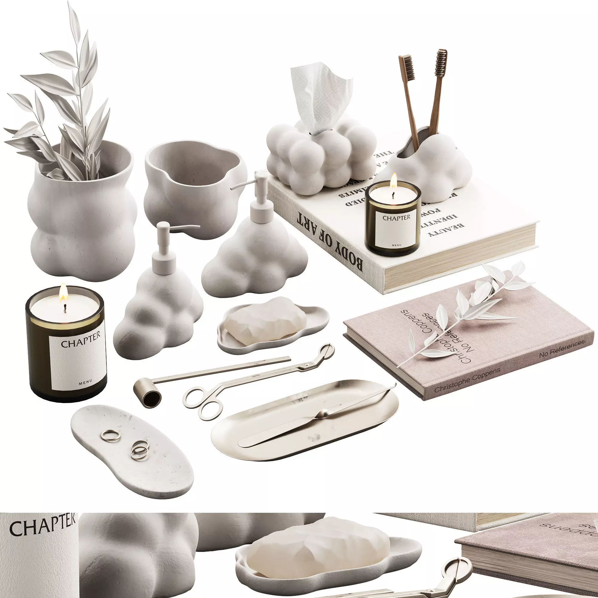 Compound:Soap/shampoo/shower gel dispenser ZARA cloud ceramic dispenser,Soap dish ZARA cloud ceramic soap dish,Glass/tumbler for toothbrushesCandle candle CHAPTER by menu /audo in two versions,Box for paper towels / napkin holder Marshmallow shape tissue box holder for napkin facial paper,Chopped soap, a vase with decorative branches, books, candle accessories (trimmer, clip, wick extinguisher), jewelry tray, jewelry.