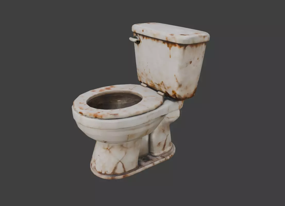 The toilet’s structure follows a recognizable, classic design: a tank-mounted flush system, rounded bowl, and thick ceramic base. However, any sense of cleanliness has long since vanished. The porcelain is discolored with deep brown stains, mineral buildup, and streaks caused by years of moisture exposure. Rust creeps along metal fittings and seams, while dirt accumulates in crevices, emphasizing how long the fixture has been unused or improperly maintained. The bowl interior appears darkened and corroded, reinforcing the asset’s unsettling presence.