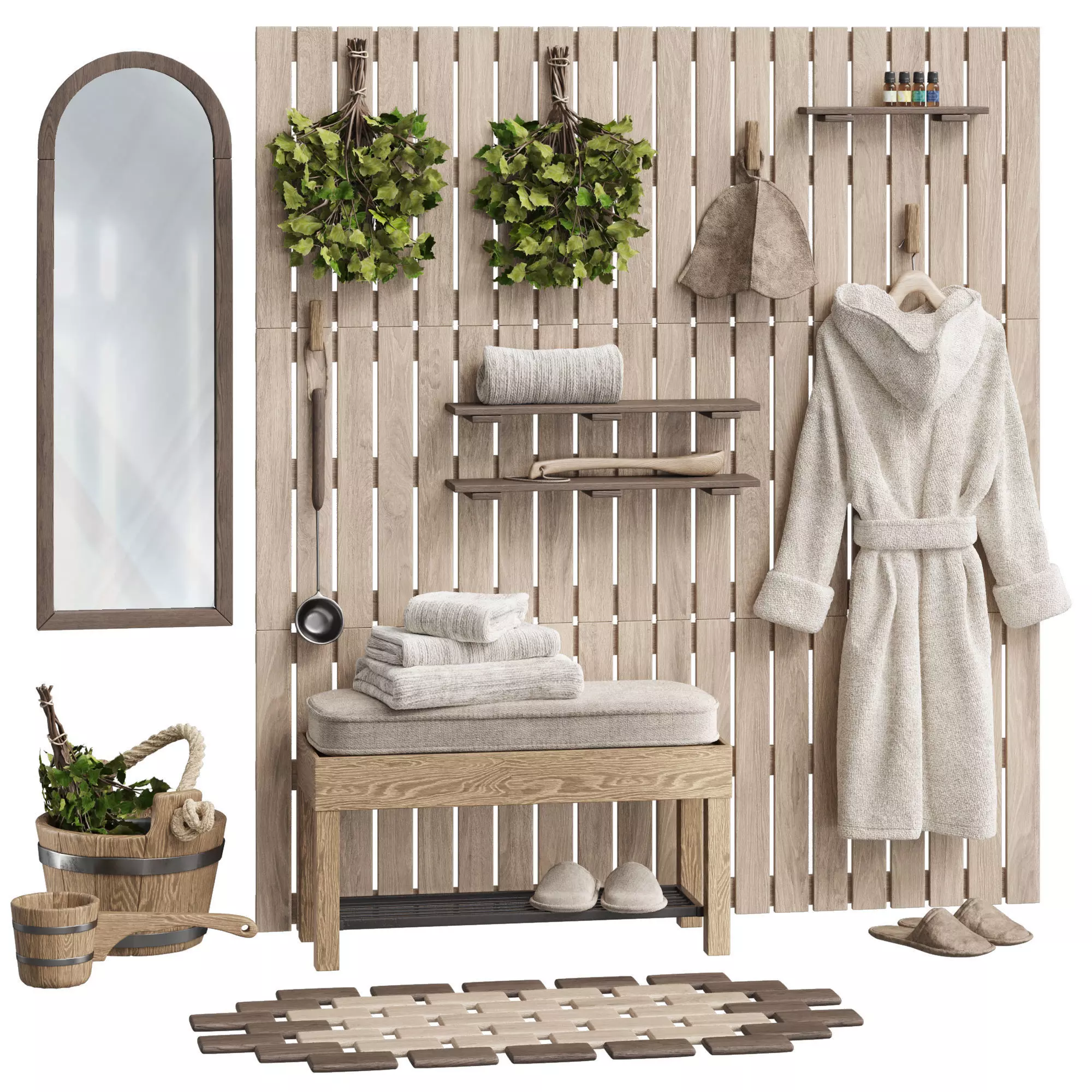 aromatherapy, bath towel, bath hat, bath set, bath set, bathrobe with hood, bucket, shelf, stool, shelf, birch broom, bench, gang, basin, ladle, ladle, thermometer, slippers, felt