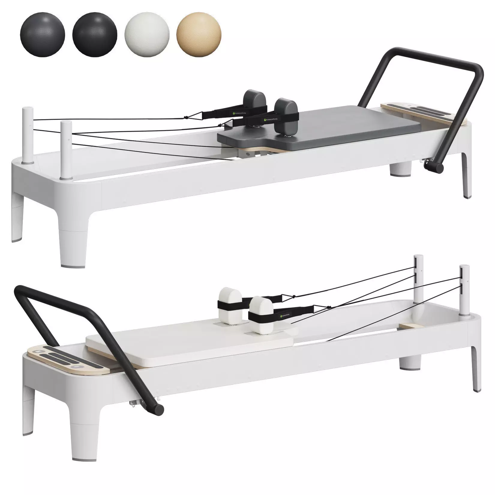 Pilates simulator from Balance Body, Allegro 2 Reformer.4 upholstery colors: Storm, Black, White, Biege. The upholstery color can be easily edited with a CoronaColor card named Vinyl ColorMaterials of CoronaPhysical, 3ds max 2018, OBJ