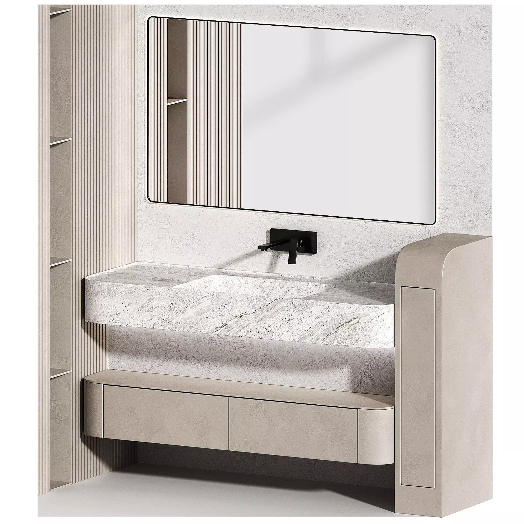 The 3D model contains a set of designer furniture for the bathroom.The set includes: a mirror, an artificial stone countertop with a narrow side and a built-in sink, a wall-mounted vanity unit, a wall-mounted faucet, a narrow shelving unit, a wall with decorative plaster material, and a niche with lighting. Semicircular furniture.