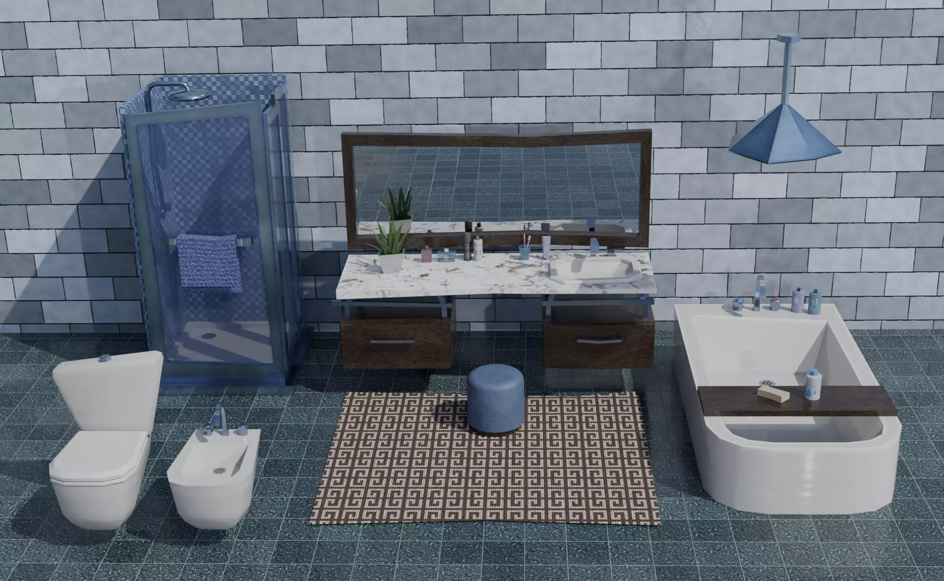 Pack of bathroom low poly furniture. 9 models with theyr own texture. Normals are open gl. The drawers, shower door and toilet seat can be opened.