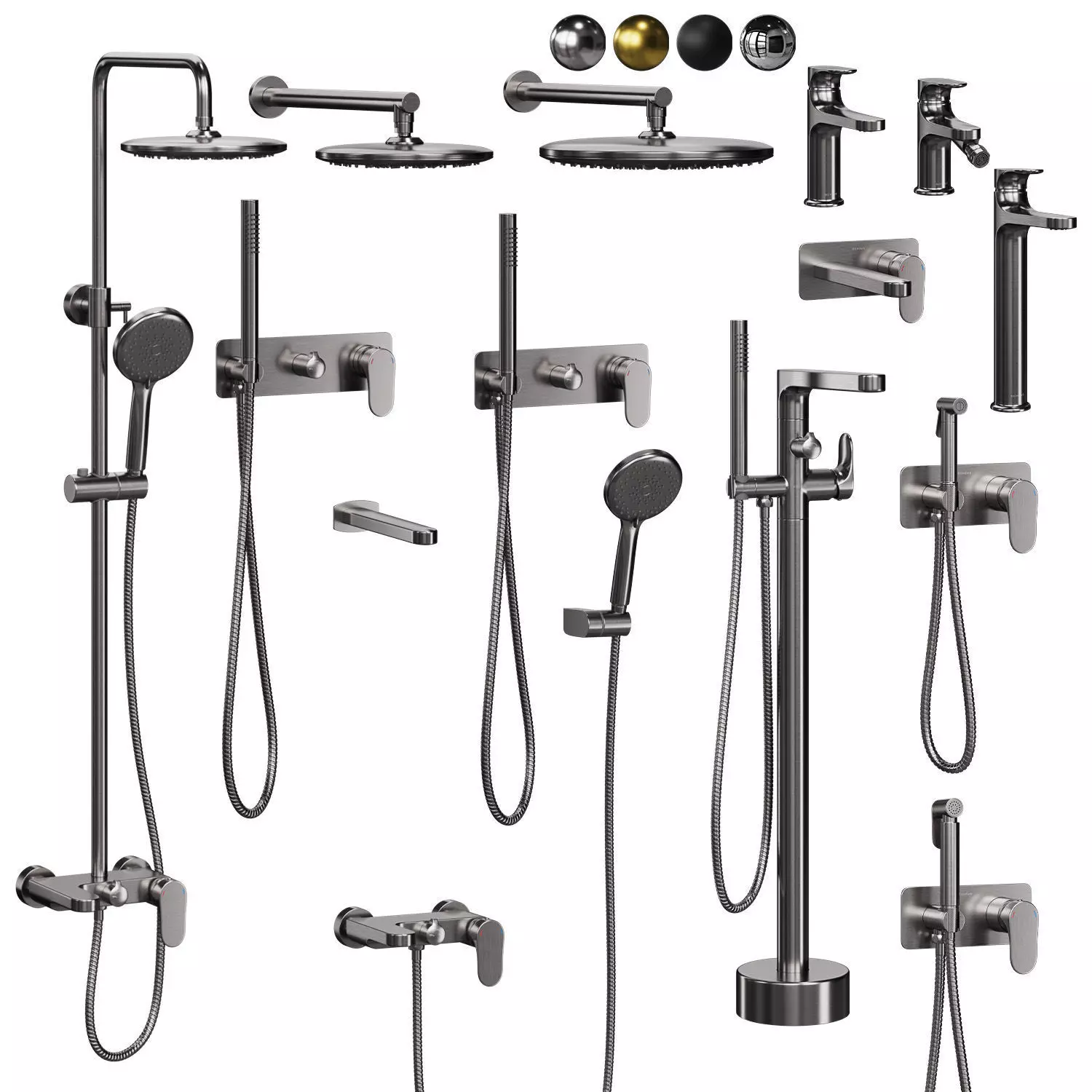 3ds Max faucets are available in 4 colors: chrome, Gold, black Matt, Nickel brushed. If necessary, the metal color can be easily edited by changing the color of the Color Node. Blender and Cinema 4d available in chrome color without labels, the color of the faucets is also easy to change.