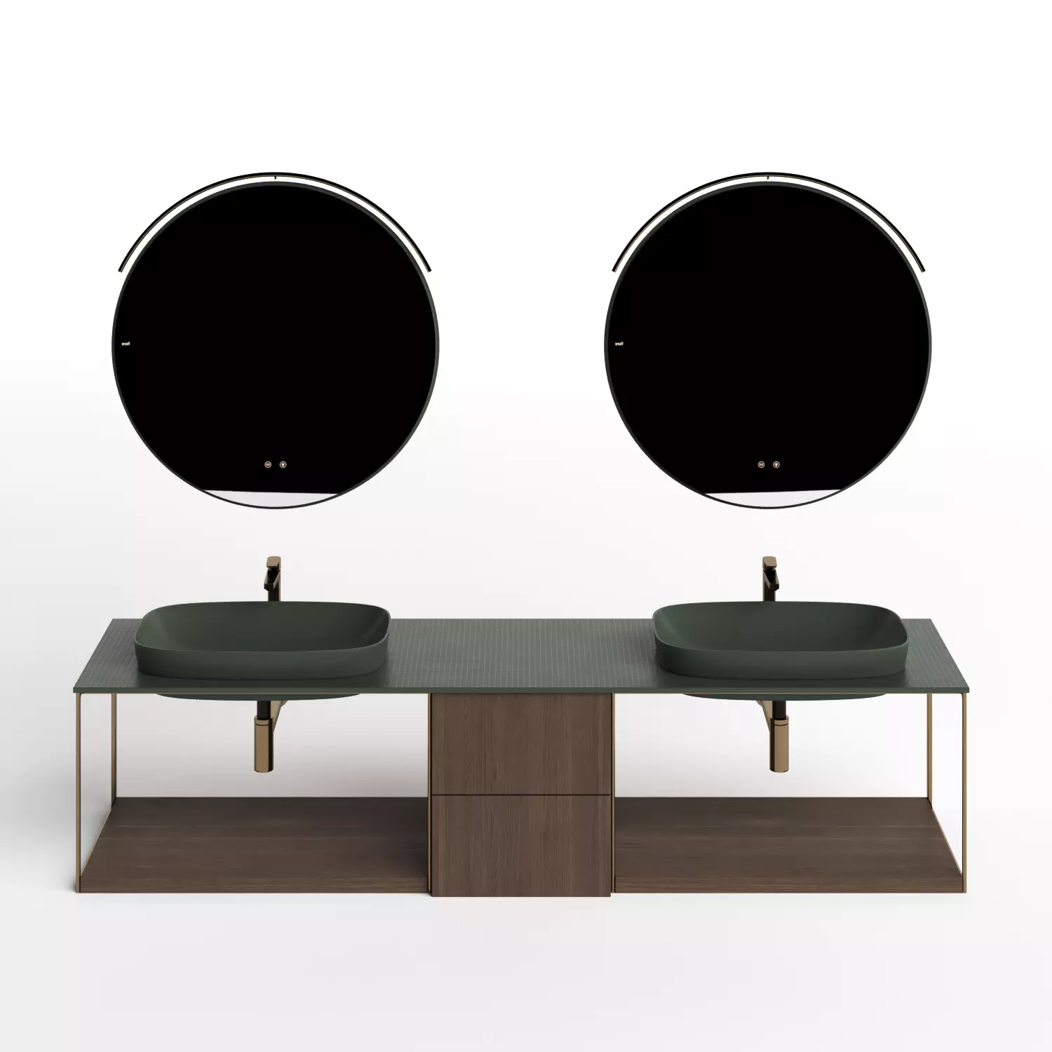 Components and DimensionsVanity Unit : The console features a metal frame with a lower shelf and a central cabinet with drawers. The top is a single piece that holds two vessel sinks. The overall dimensions of a double vanity from this collection can vary. For example, a similar model on Amazon has a width of 92 inches (approximately 233.7 cm).Vessel Sinks : The sinks are green, rectangular, and sit on top of the countertop. Similar models of sinks from Ceramica Cielo, such as the Multiplo, are known for their minimalist design.Mirrors : The mirrors are round with a thin black frame and an integrated light source at the bottom.Faucets : The faucets are wall-mounted, two-hole mixers with a bronze or brass finish, complementing the metal frame of the vanity