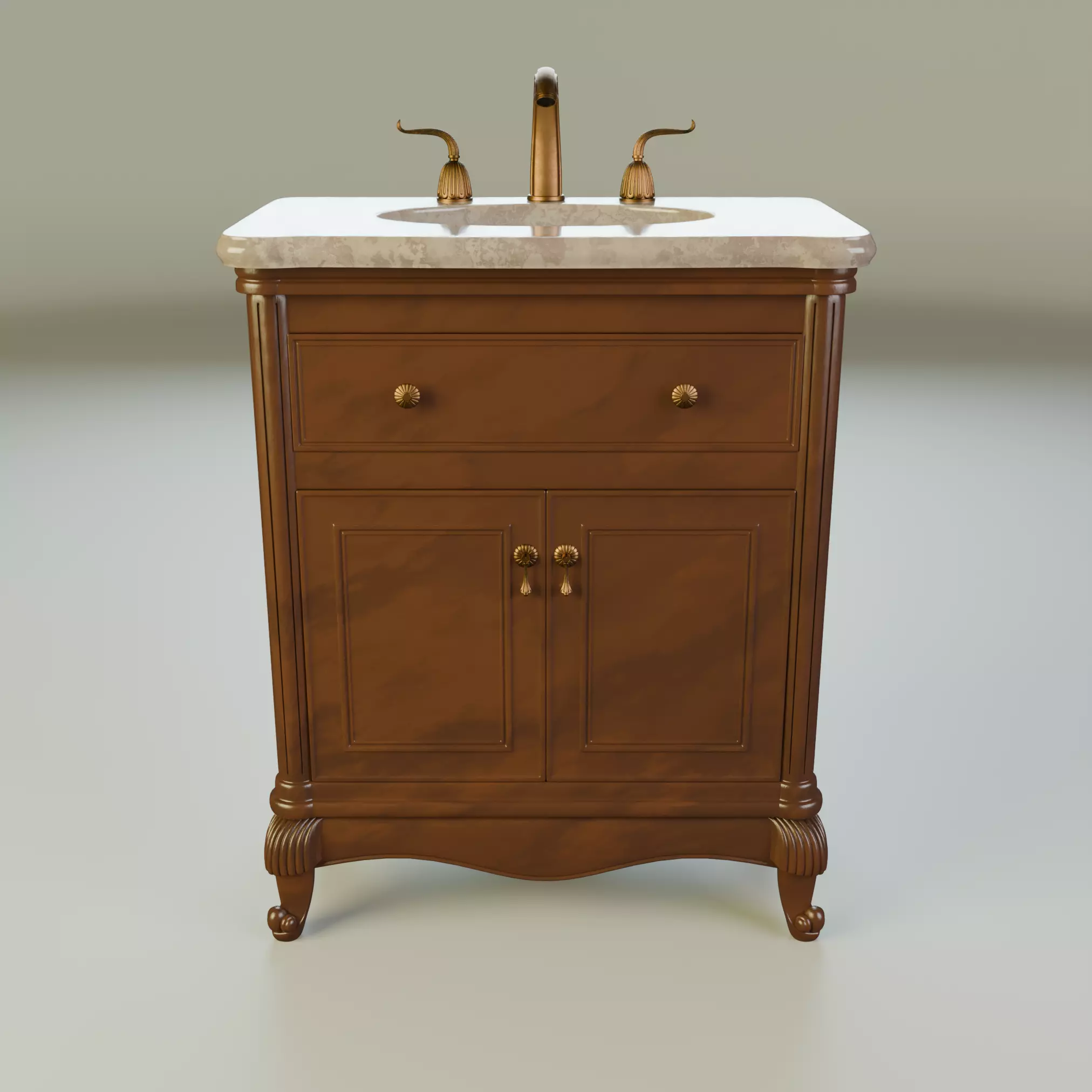 High-quality 3D model of a classic-style bathroom vanity featuring detailed wooden cabinetry, a realistic stone countertop with integrated sink, and vintage brass faucet fixtures. Suitable for architectural visualization, interior design, product visualization, games, and cinematic projects.The model was created with clean topology and optimized geometry, using physically based materials for accurate rendering in modern pipelines.All materials follow a PBR workflow and are ready for use in major render engines.